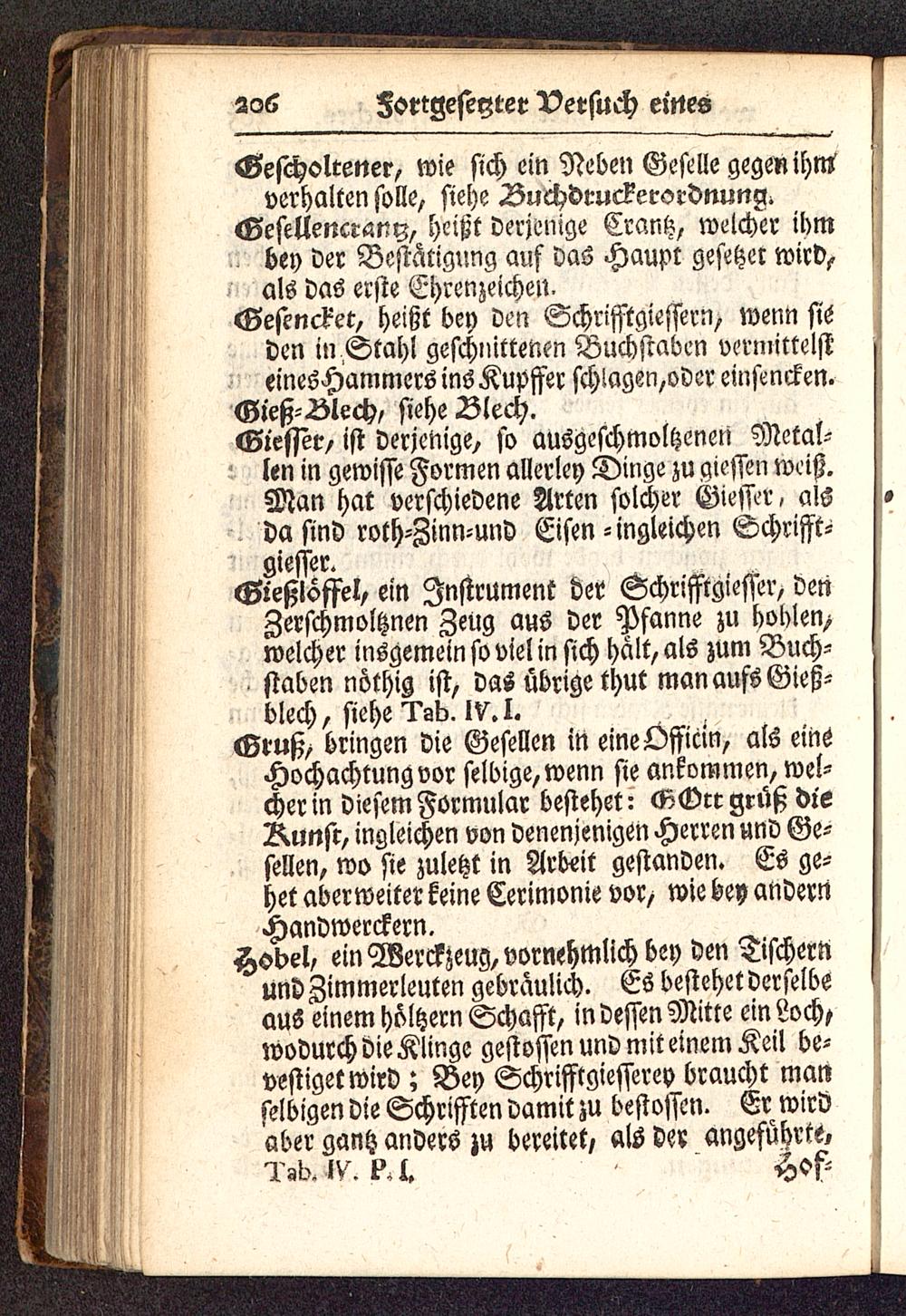 Hobel, ein Werckzeug, vornehmlich bey den Tischernund Zimmerleuten gebraulich. Es bestehet derselbeaus einem höltzern Schafft, in dessen Mitte ein Loch,wodurch die Klinge gestossen und mit einem Keil be-vestiget wird ; Bey Schrifftgiesserey braucht manselbigen die Schrissten damit zu bestossen. Er wirdaber gantz anders zu bereitet, als der angeführte,T9b.IV. PA, Hof -