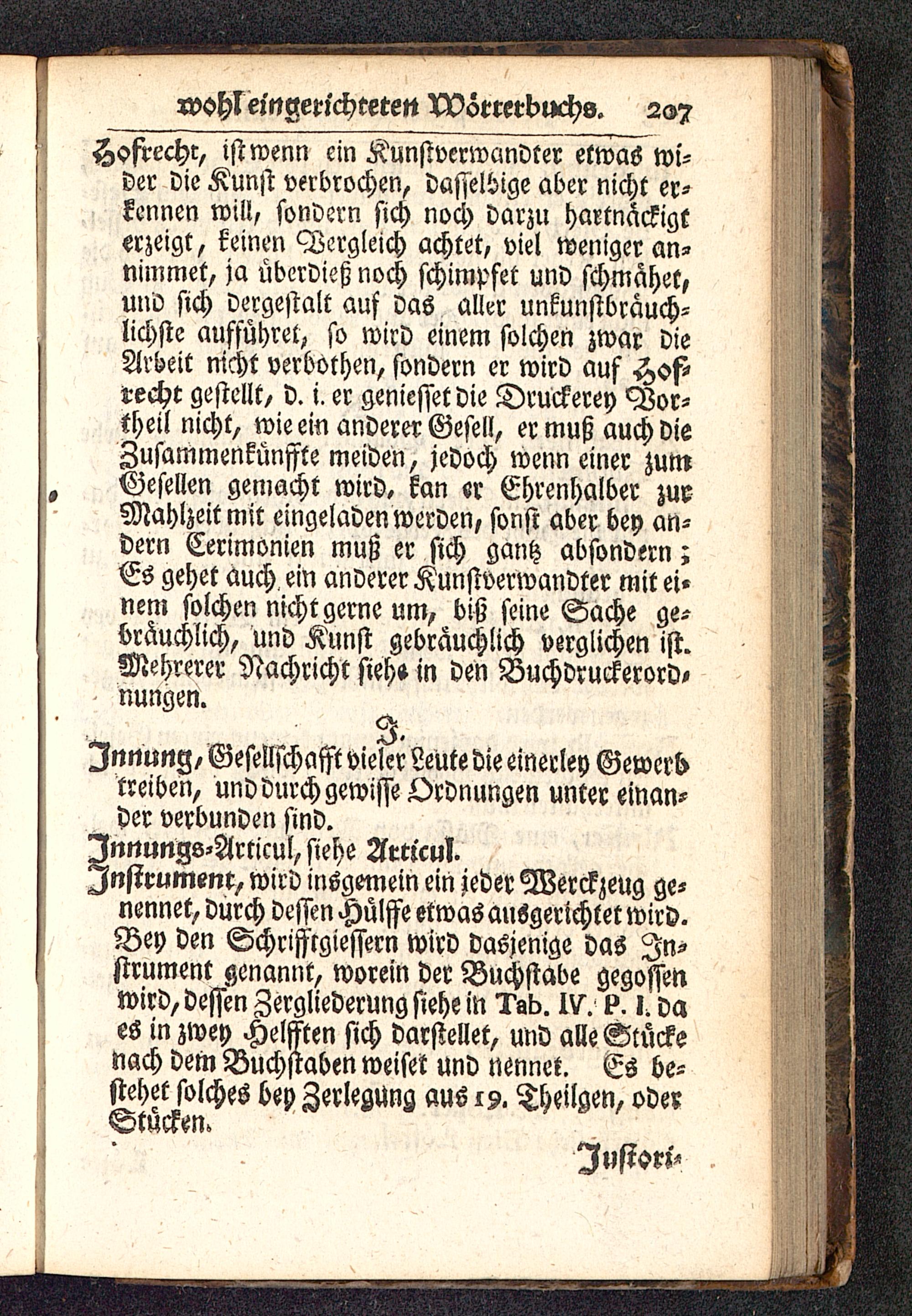 Instruments wird insgemein ein jeder Werckzeug ge-nennet, durch dessen Hülffe etwas ausgerichtet wird.Bey den Schriftgiessern wird dasjenige das In-strument genannt, worein der Buchstabe gegossenwird, dessen Zergliederung siehe in Tab. IV. P. I, daes in zwey Helfften sich darstellet, und alle Stückenach dem Buchstaben weiset und nennet. Es be-stehet solches bey Zerlegung aus 19. Theilgen, oderStücken.