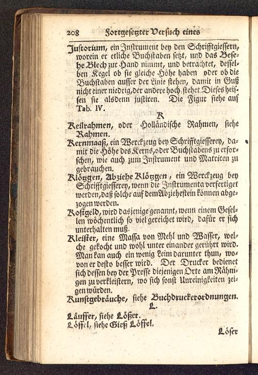 Iusrorium, einJnstruinent bey den Schrifftgiessern,worein er etliche Buchstaben setzt, und das Äese-heÄlech zur Hand nimmt, und betrachtet, &ej|el<ben Kegel ob sie gleiche Höhe haben oder ob dieBuchstaben ausser der Linie stehen, damit in Gußnicht einer niedrig,der andere yocl> stehet.Dieses heis-sen sie alsdenn justiren. Die Figur siehe aufTab. IV.