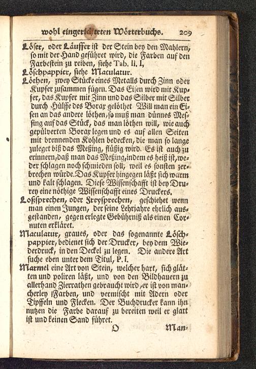 Köchen, zwey Stücke eines Metalls durch Zinn oderKupfer zusammen fügen. Das Eisen wird mitKup«fer, das Kupfer mit Zinn und das Silber mit Silberdurch Hülffe des Borax gelölhet Will man ein Ei-sen an das andere löthen,fv muß man dünnes Me(Vsing aufdas Stück, das man lochen will, wie auchgepulverten Borax legen und es auf allen Seitenmit brennenden Kohlen bedecken, die man so langezuleget biß das Meßing, flüßig wird. Es ist auch zuerinnern,daß man das Meßing,indem es heiß ist,we-der schlagen noch schmieden soll, weil es sonsten zer«brechen würde.Das Kupfer hingegen laßt sich warmund kalt schlagen. Diese Wissenschafft ist bey Dru-rey eine nöthige Wissenschafft eines Druckers.