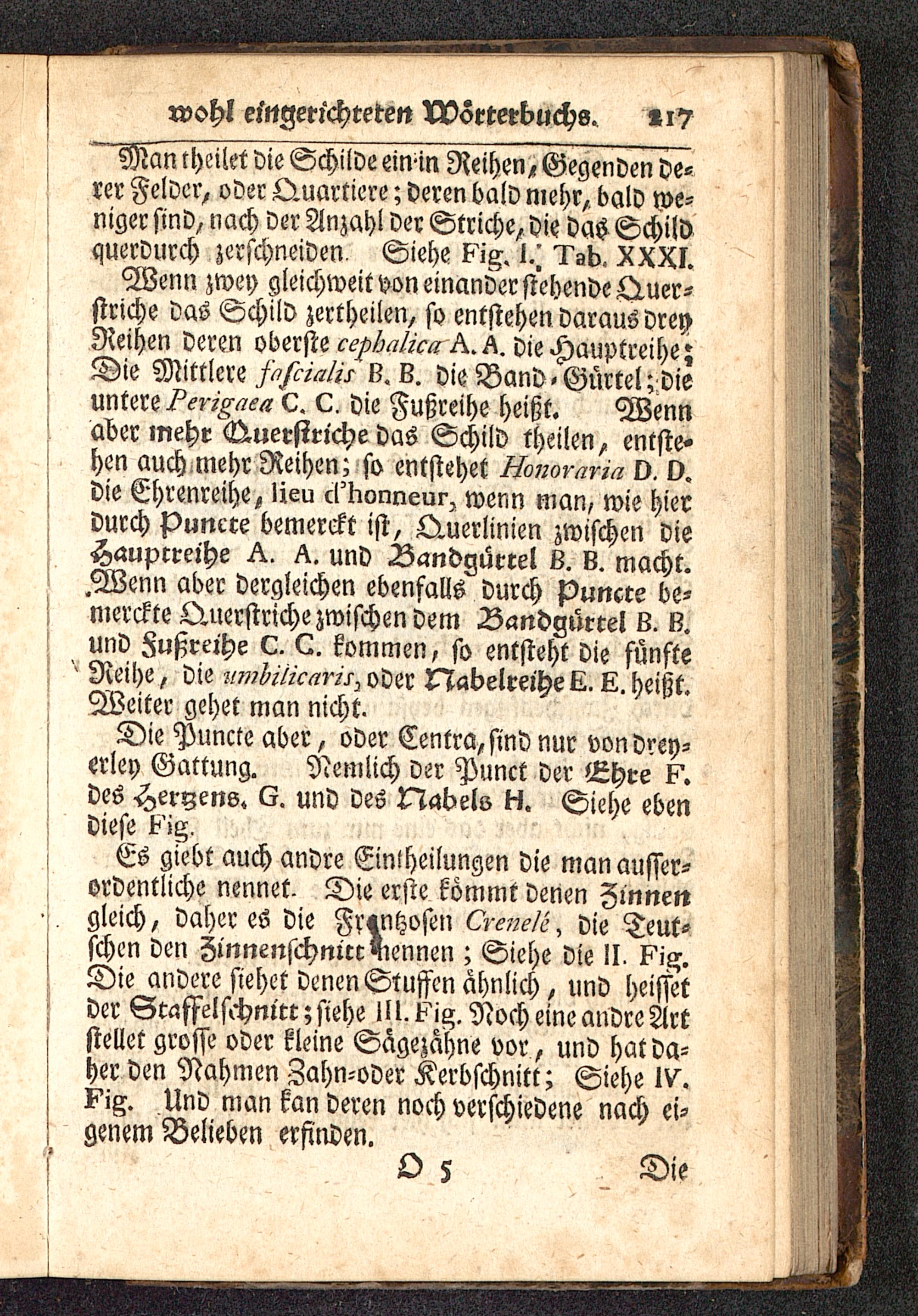 "Man theilet die Schilde ein-m Reihen, Gegenden de-rer Felder, oder Quartiere; deren bald mehr, bald we-niger sind, nach der Anzahl der Striche, die da^ Schilvquerdurch zerschneiden^ Siehe Fig. I/ Tab. XXXI.