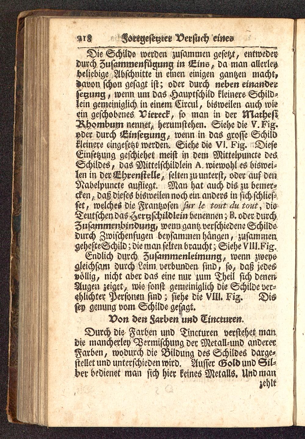 Durch die Farben und Tlncturen verstehet mandie mancherley Vermischung der Metall-uny andererFarben, wodurch die Bildung des Schildes darge-stellet und unterschieden wird. Ausser Gold und &iUher bedienet man sich hier keines Metalls. Und man