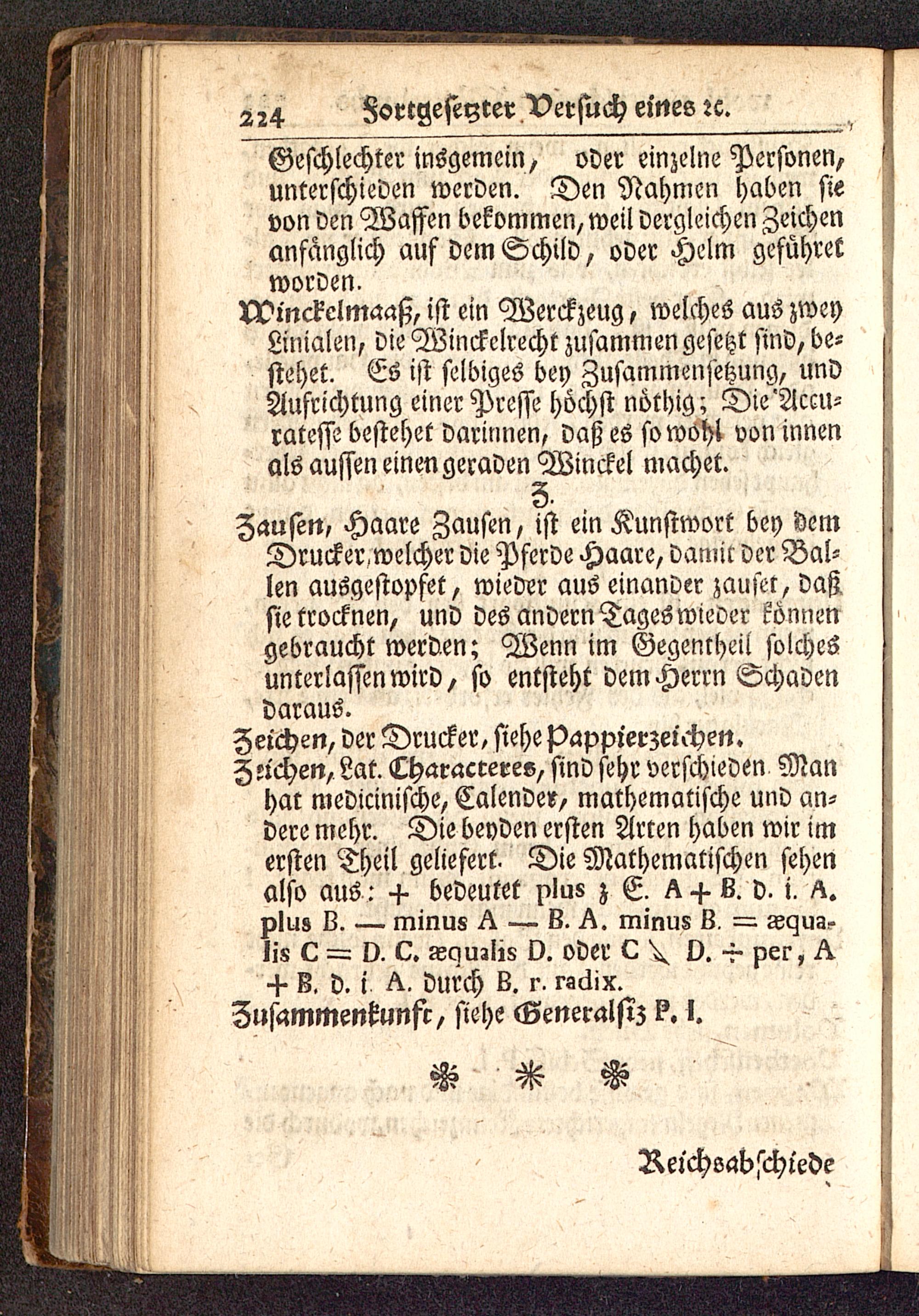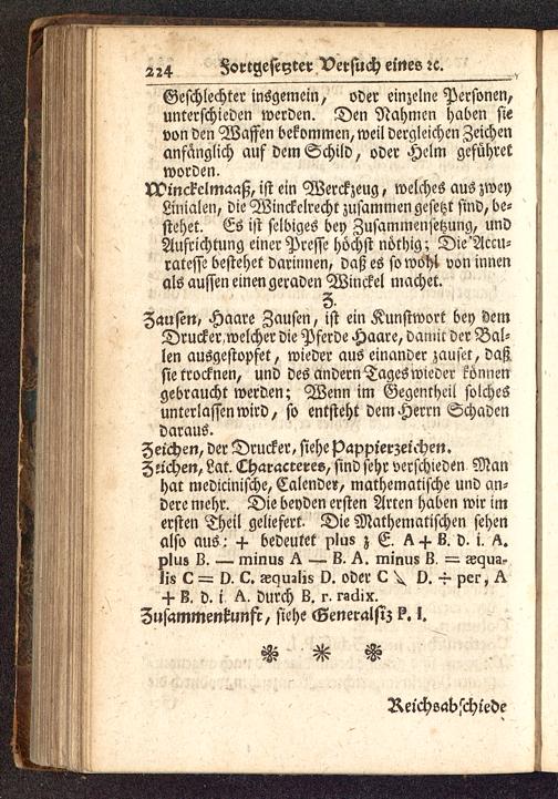 Zeichen, Lat. Lharaccerev, sind sehr verschieden Manhat medicinische, Calender, mathematische und an-dere mehr. Die beyden ersten Arten haben wir imersten Theil geliefert. Die Mathematischen sehenalso aus : + bedeutet plus j A + ß. D. i. a.plus B. — minus A — B. A. minus B. — aequa?Iis C=D.C, asqualis D. oder C \ D. ~ per, A+ B, d. i A. durch B. r. radix.