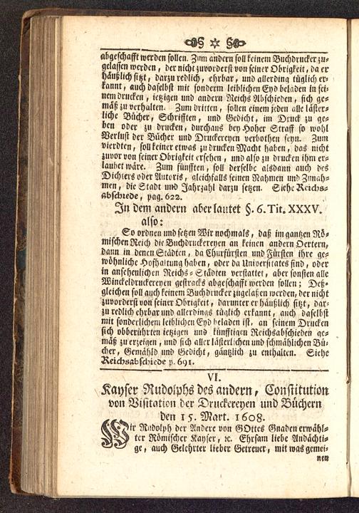 Co ordnen und setzen Wir nochmals, daß im gantzcn Rö-Mischen Reich die Buchdruckereycn an keinen andern Ocrtern,dann in denen Städten, da Churfürsten und Fürsten ihre gc-wohnliche Hofhaltung haben, oder da Umversnatcs sind, oderin anschcnlichcn Reichs-Städten verstattet, aber sonsten alleWinckeldruckereyen gestracks abgeschafft werden sollen; Deß-gleichen soll auch keinem Buchdrucker zugelasien werden, der nichtzuvorderst von seiner Obrigkeit, darunrcr er haußlich sitzt, dar-zu redlich ehrbar und allerdings tüglich erkannt, auch daselbstmit sonderliche»! leiblichen Eyd Maden ist, an seinem Druckensich vbbcrührtcn jetzigen uns kunfftiam Reichsabschiedcn ac-maß zu erzeieien , und sich aller lästerlichen und schmählichen Bü-chcr, Eeniahld und Gedicht, gantzlich zu enthalten. SieheRetcksabsclileve p. 691.