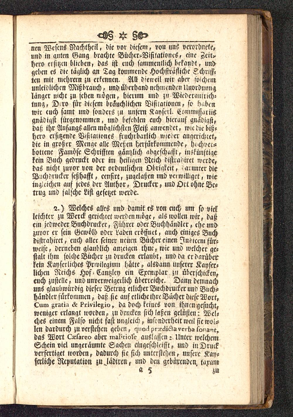 nett Wesens Nachtheil, die vor i>icfcm , von uns verordnete,und in anten Gang brachte Büchcr-Visitationes, eine Aeir>hcro ersilzM blieben» das ist euch sammentlich bckandt, un>geben e6 Die täglich an Tag kommende Hochstrafliche Lchriff-tcu mit mchrern zu erkennen. All dieweil wir aber !v>chcmunleidlick)cn Mißbrauch, undübcrhand »ehn-enden Unordnung,länger nichl zu jcljm n,ögcn, hierum und ;» Wiederiiiisrich»tnng, D ro für diesem bräuchlichm Visitationen, so habenwir euch samt und sonders iß unsern Kaosirl. CorMtssariisgnädigst fürycnommcn, und beftklcn euch hicrunf gnädigst»daß ihr Anfangs allen möglichsten Fleiß anwendet, wie die biß-hero ersitzende V-sitaiioncs fruchrbarlich wieder angcrichict,die in großer Menge alle Mcßcn hersürkvmmcnde^. hl-chver-lottern: Famose Cchrifftcn gantzlich abgeschafft r insküiijtiqekein Vnch gedruckt oder im heiligen Reich distral'irct werde»das nicht zuvor von der ordentlichen Obrigkeit, > auutter dieBuchdrucker seßhafft, ccnsirt, zuqelaßcn und vc> williget, wiejngieick)cn aus jedes der Author, Drucker^ und Ort ohne Be-trug und falsche List gefttzet werde.