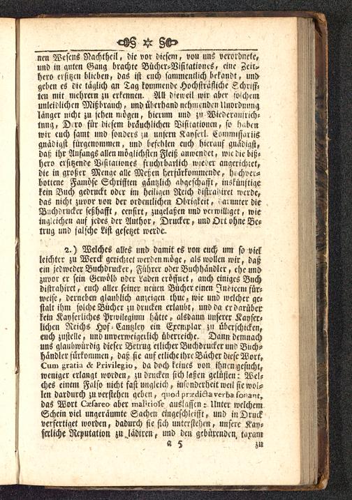 2.) Welches alles und damit cs von euch um so vielleichter zu Wcrck gerichtet werden möge, als wollen wir» baßein jedweder Buchdrucker, Führer oder Buchhändler» chc uni?zuvor er sein Gcwölb oder l'ciden eröffnet, auch einiges Buchdistrahirct, euch aller seiner neuen Bücher einen Inr icem für-weise, derncbm glaublich anzeigen ihm:,, wie und welcher ge-stall ihm solche Bücher zu drucken erlaubt, und da er darüberkein Kaysci liches Privilegium hatte» alsdann unserer Kayscr-lichen Reichs Hvf> Cantzlcy ein Exemplar z» übcrschicken»euch zustelle, unv uiiverweigerlich überreiche. Dann demnachuns glaubwürdig dieser Betrug etlicher Buchdrucker und Buch-Händler sürkommen, daß sie auf etliche ihre Bücher dieseWort»Cuni gratia & Privilegio, da doch keines von ihnen gesucht»