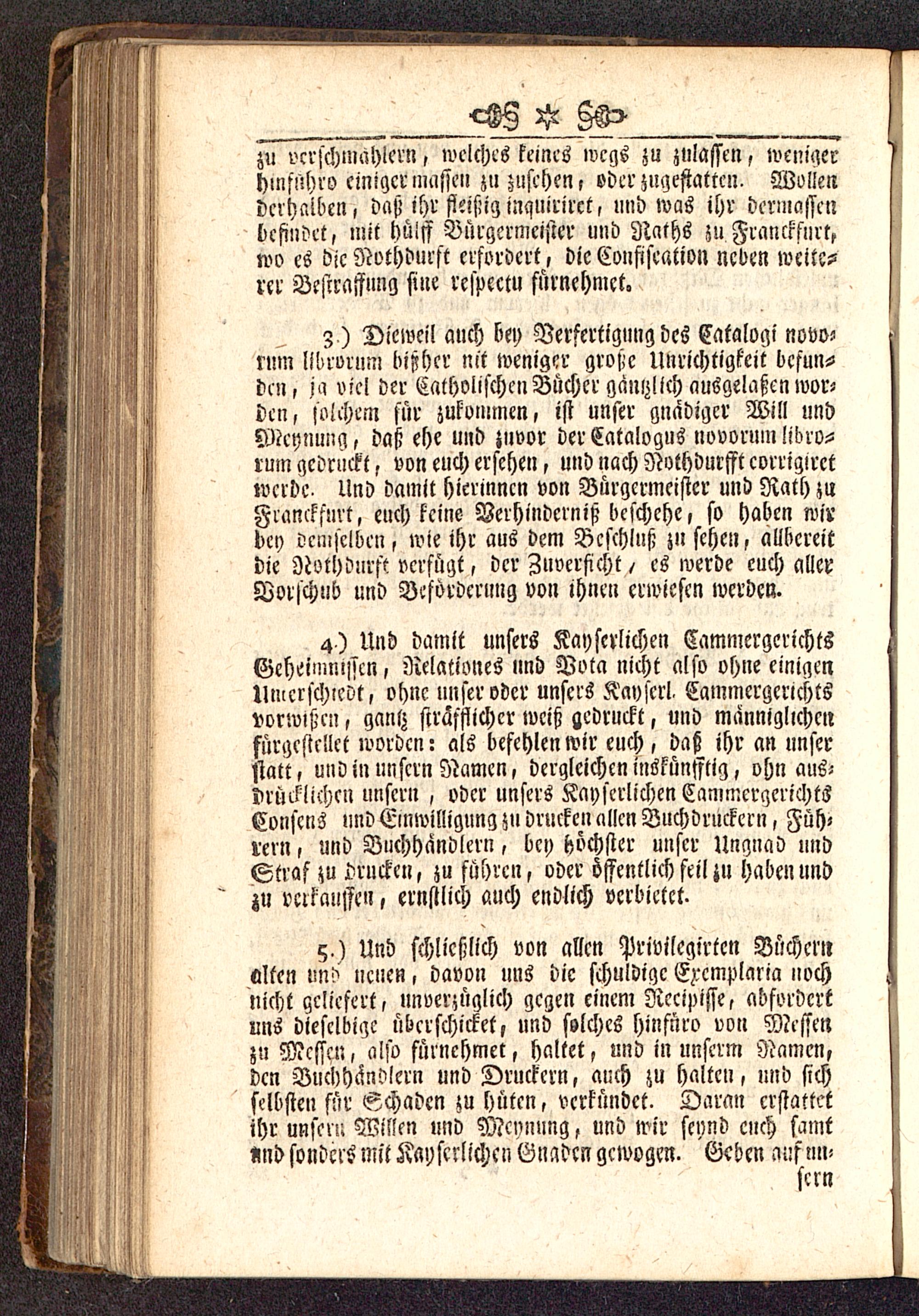 5. ) Und schließlich von allen Privilcgirtcn Büchernalten und neuen, davon uns die schuldige Excmplarta »ochnicht geliefert, unverzüglich gegen einem Reciyisse, abfordertuns biesclbigc übcrschicket, und solches hinfüro von Messenzu Messen, also fürnehmet, haltet, und in unserm Namen,den Buchhändlern und Druckern, auch zu halten, und sichftlbsten für Schaden zu hüten, verkündet. Daran erstattetihr unsern Willen und Meynung, und wir scynd euch samt«nd sonders mit Kayscrlichen Gnaden gewogen. Geben anf un-