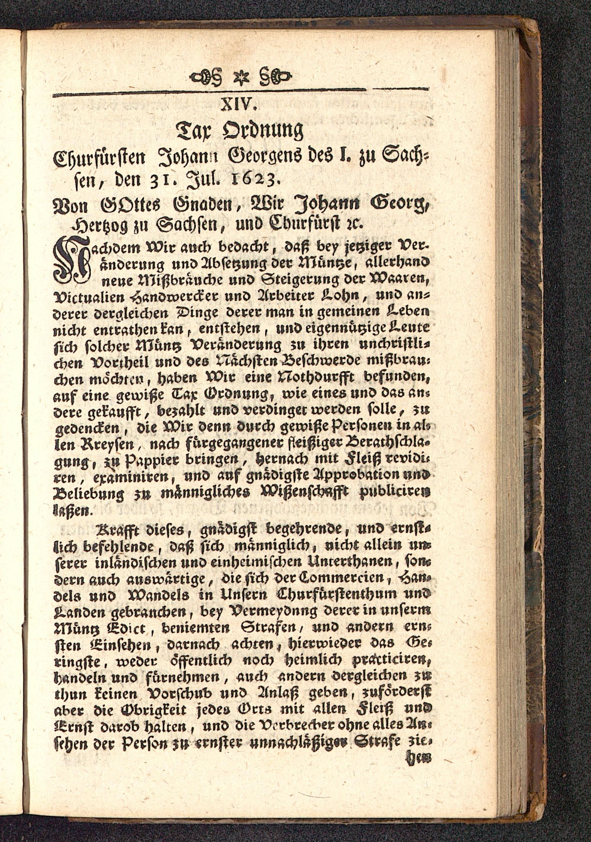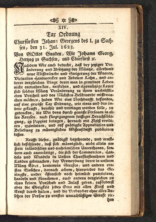 f^achvem XÜiv auch bedacht, daß bey jetziger Ver-v( Änderung und Abseyung ver ZNünye, allerhans^ neue Mißbrauche unv Steigerung ver Waaren,Victualien -Hanvrvercker unv 2trbeiter K.ohn, und «>,-verer dergleichen Dinge derer man in gemeinen A.ebennicht emrathen tan , entstehen, und eigennützige L.eutesich solcher Müny Veränderung ;u ihren unchristli-chen Vortheil und deo wachsten Beschwerde mifibrau-chen mockecn, haben XCiv eine Nothdurfft befunden,auf eine gewiße Tax (Ordnung, rvie eines und das an-vcre gekaufft, befahlt und vervinger werden solle, ;ugevencken , die Nl?ir denn durch gewifie Personen in al»len Rreysen, nack fürgegangener fleißiger Berarhschla»gung, zu Pappier bringen, hernach mit Fleiß revidi-xen , eraminiren, und auf gnadigste Approbation un»Veliebung 5» wonnigliches «?ißensch«fft publicire«
