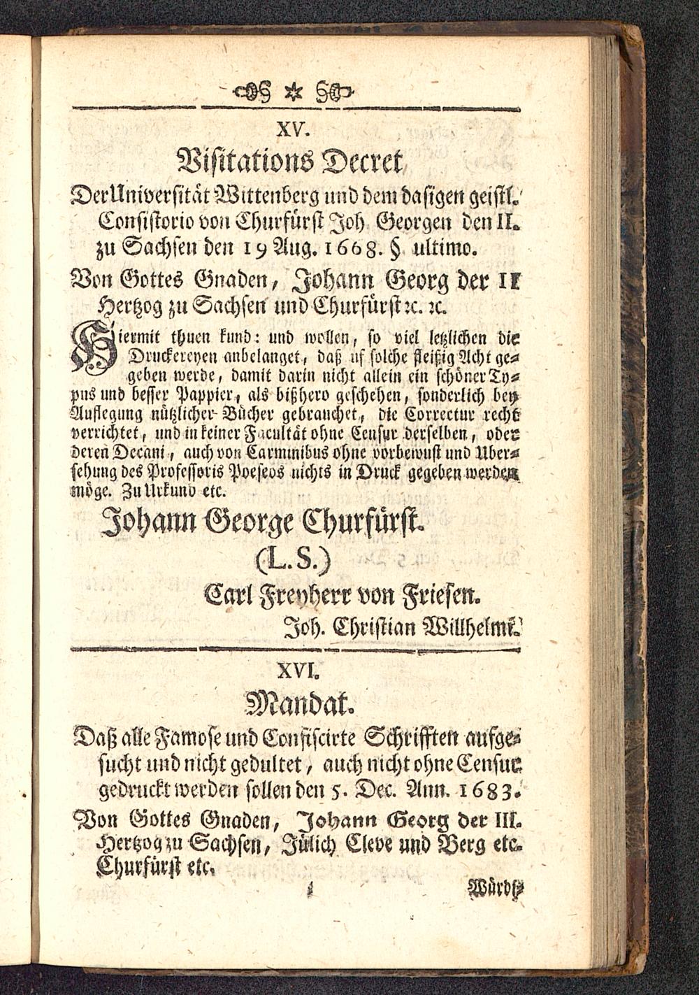 hiermit thuen kund: und wollen, so viel IchliKcn dieDruckcrcye» anbelanget , daß uf solche fleißig Acht qc--geben werde, damit darin nicht allein ein schönerTt)»pns und besser Pappicr, als bißhero geschehen t sonderlich beyAuflegung nützlicher- Bücher gebrauchet, die Correctur rechtverrichtet, und in keiner F icultat ohne Censur derselben, odcLderen Dccani, auch von Carnnnibus ohne vorbewust und Über--schung des Professoris Poeseos nichts in Druck gegeben wtiw.möge. ZuUrkuno etc.