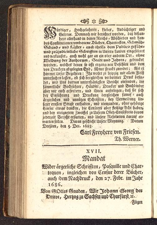 ^M^ördiger, Hochgelahrtkr.. Kebcf, Andächtiger und'w^f Getreue. Demnach wir berichtet worden, da>! btßan-<2?Ö!' hero allerhand in denen Reichs - Abschieden und Lan-des-ConstltmivnenverboleneVüclicr^ Chartecken, Sckmtth-Sc!?and- unv)!.»:ster- auch rheils Vem pnblico gef.:hr-wnö prajudlcirlicke Scbriffren in Unsern Landen eingesuhrctund vcrkauffct, auch wohl gar an ein oder andern« Ort, ohneiTkiöung ver Authorvm, Sravt unv Jahres / gcdrucketworden, welches denen so osst ergangcncn Befehlen und demvon Druckern abgelegten Epd, schnür stracks zuwider; Aisisthiermit Un ser Begehren: Ihr wollet ;u Leipzig mit allem Fleißuntersuchen lassen, ob sich dergleichen verbotener Druck befin-des, und 11ns daroon untcrthanigstcn Bericht einsenden, diesämmtliche Bnchsührer, Handler, Drucker und Buchbinderaber vor euch erfordern, und ihnen auferlegen, daß sie sichder E'nsührung und Druckuuq dergleichen famos - auchärgerlichen und unnützen Schafften, bey Vermeidung Un-serer ernsten Strafe enthalten, und niemanden, ohne gehörige^cnsur etwas drucken, die Eensorcs aber fleißige Acht haben»und bey crcignetcm Zweiffcl zu Unserm Ober-Consistorio davonjederzeit Bericht erstatten» und Unsere Resolution darauf er-warten sollen. Daran geschicht Unsere Meynung. DatumDreßden, den 5- Dec. i6gz.