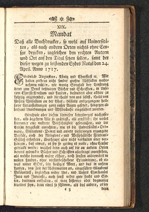 M^ricdrick Auguftus, König und Churfürst ic Wirtf^- ^abcn zeithero nicht sondcr großen Mißfallen wahr-nehmen müßen, wie wenig Sorgfalt bey Ccnsirungderer zum Druck destinirten Bnchcr und Schafften , in Unse-ren, Chmsnistenthnm und Landen, besonders aber allhicr zuLeipzig angewendet, und die theils von uns selbst, theils vonUnsern Vorfahren an der Chnr, dtßfalls ausgegangene heil-same Veranstaltungen gantz außer Singen gesctzct, hingegen al-lerhand Unordnnngen und Mißbranche eingeführet worden.