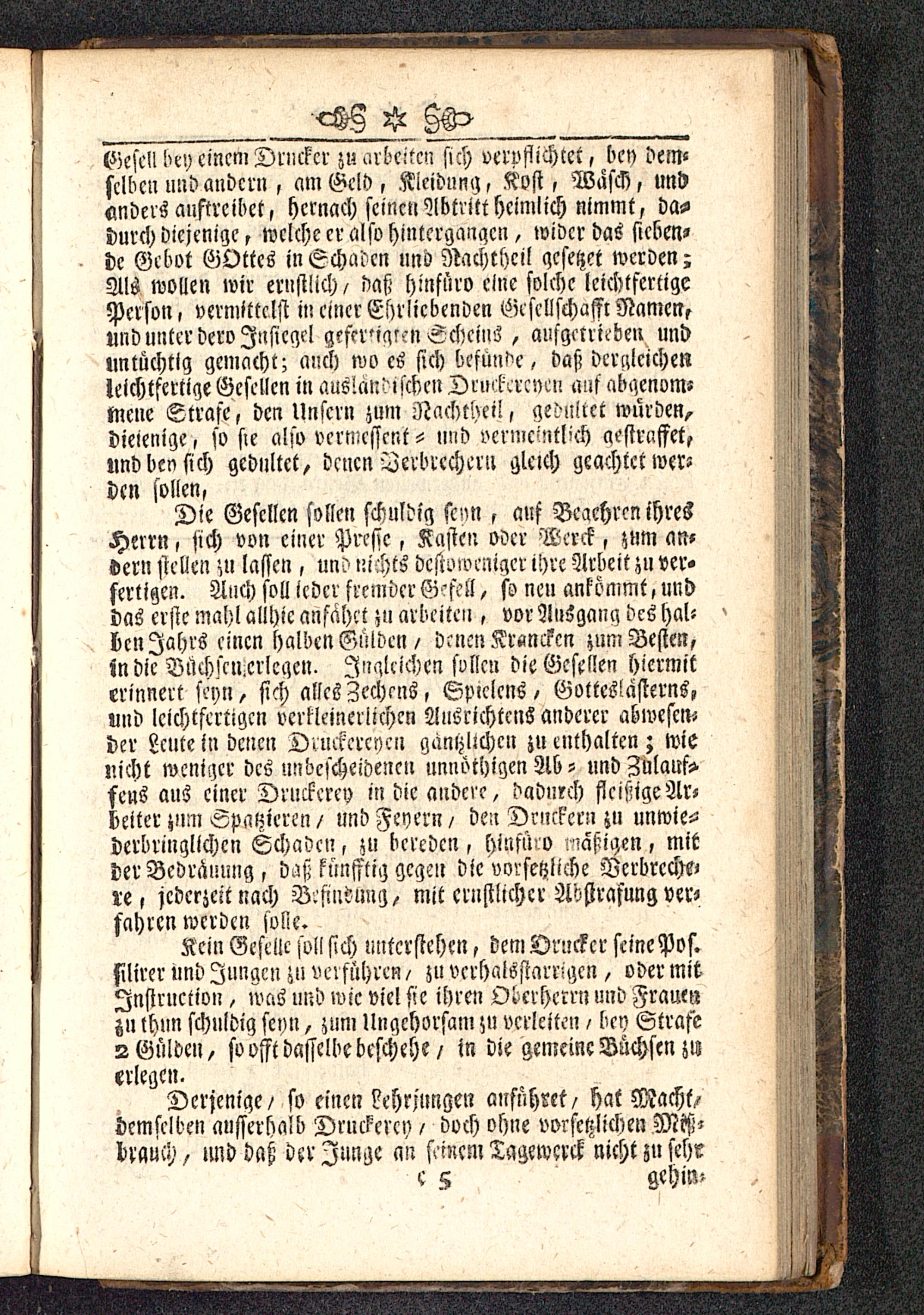 Kein Geselle soll sich unterstehen, dem Drucker seine Pos.silirer und Jnngcn zu verfahren / zu verhalöstarr-gcn , oder mitJnstruction, was und wie viel sie ihren Oberhcrrn und Frauenz» thun schnldig seyn, zum Ungehorsam zn verleiten/ bey Strafe2 Gülden, so osst dasselbe bcschehe/ in die gemeine Büchsen ziserlegen.