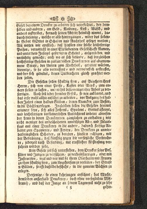 Die Gesellen sollen schuldig scnn , auf Beachrcn ihresHerrn, sich von einer Presse, Kasten oder Wcrck, zum an»der« stellen zu lasse» , un^ nichts dZiköwenjger ihre Arbeit zn ver-fertigen. Auch soll icder fremder G'fcil, so neu ankömmt, unddas erste mahl allhic anfah-t ;u arbeite» , vor Wjgang des hal-bcn Jahrs einen halben Gülden / denen Kranckcn zum Beste»,in die Bächsc^erlcqcn. Jnatejcheu solle» die Gesellen hiermiterinnert seyn, sich alles Zechens, SpieleyS, Gottesiasterns,und leichtfertigen vcrklcinerlichen Ausrichtens anderer abwcscn-der Lcnte in denen Drückereye.» gäntzUcheu zn enthalten ; wienicht weniger des unbescheidenen unnöthigen Ab - und Zulauf-»feus aus einer Druckerei) in die andere, dadurch fleißige Ar-Vetter zum Spatzieren / und Feuern / den Druckern zn unwie--derbriiiglichcn Scheiden, zu bereden , hinfü-o mäW« , mitder Bedräuung , daß künfftig gegen die voksetzliche Verbreche»re» jederzeit nach B.siudnng, mit ernstlicher Abstrafung ver-fahren werden solle.