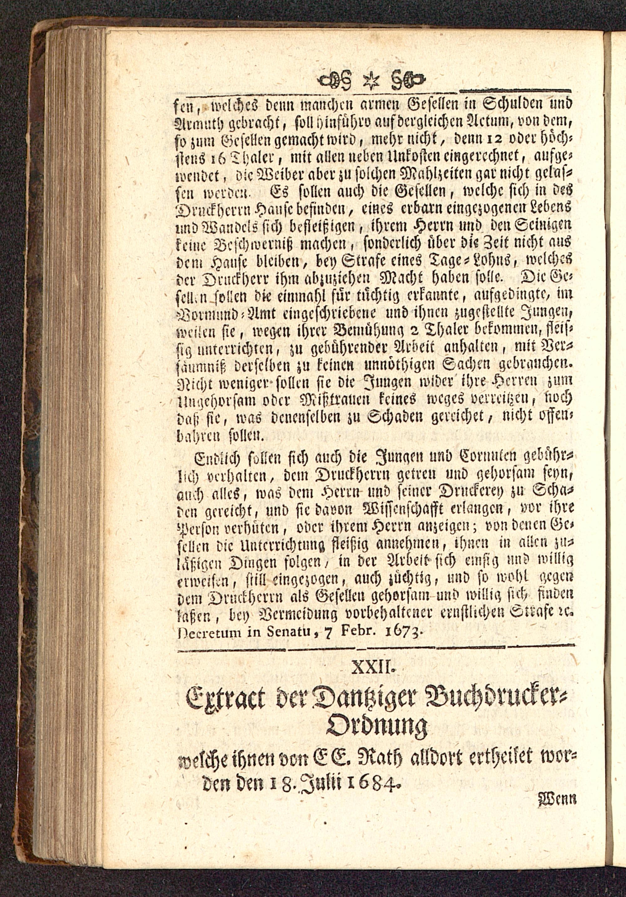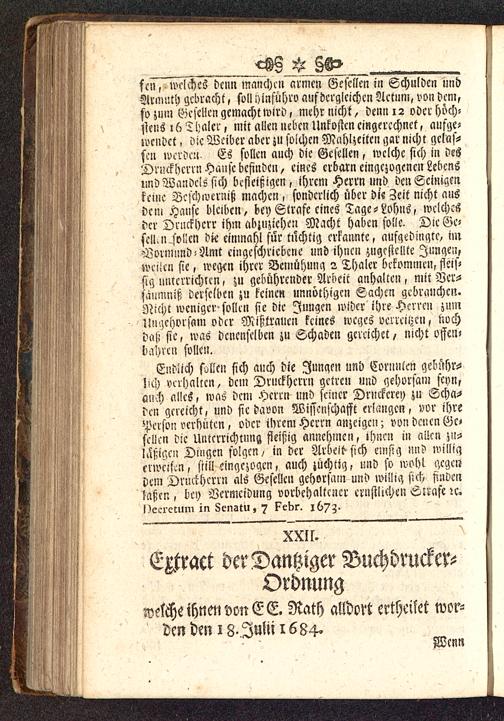 fcn, welches Demi mmicheu armen Gesellen in Schnldcn undSlrmutb gebracht, soll hlnKhry aufdergleichcn ActM» von dem,so zum Gesellen gemacht wird, mehr nicht, denn 12 oder hvch-sicus 16 Thaler, mit allen neben llnfoficn eingerechnet, ausge-wendet, die Weiber aber zn solchen Mahlzeiten gar nicht gelas-seil werden Es sollen auch die Gesellen, welche sich in desDnnf Herrn Hanse befinden, eines erbarn eingezogenen Lebensund Wandels sich besicißigen, ihrem Herrn und den Seinigcnkeine Beschwerniß machen, sonderlich über die Zeit nicht ansdem Hanse bleiben, bey Strafe eines Tage-Lohns, welchesder Dnickhcrr ihm abzuziehen Macht haben solle. Die Ge-sellui.svllen die einmahl für tüchtig erkannte, aufgedingte, imVormund! Amt eingetriebene und ihnen zugestellte Jungen,weilen sie, wegen ihrer Bemühung 2 Thaler (nfomtnen, Ms«(ig unterrichten, zu gebührender Arbeit anhalten, mit Vcr--fäumniß derselben zu reine» unnöthigen Sachen gebrauchen.Nicht weniger sollen sie die Jungen wider ihre Herren zumUngehorsam oder Mif'ttauen keines wcgcs vcrreitzcn, üvchdaß sie, was dcncnsclben zn Schaden gereichet, nicht offen-bahren sollen.