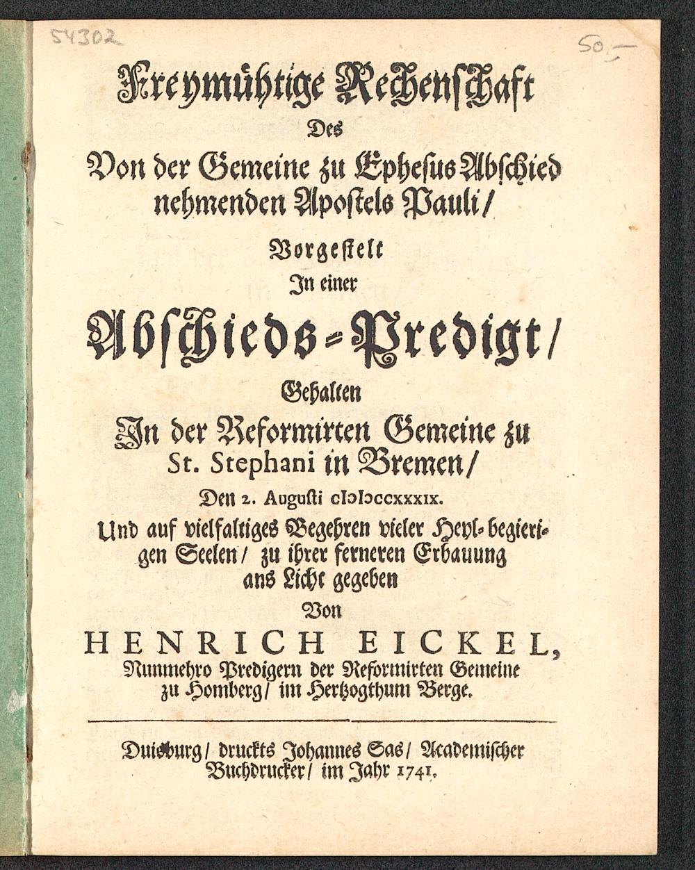 Nunmehro Predigern der Neformirten Gemeinezu Homderg/ im Hertzogthum Berge.