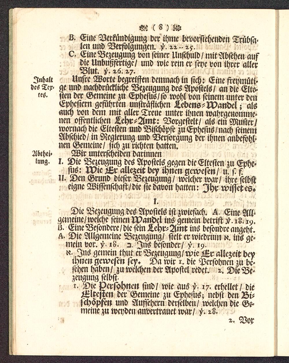 Inhalt Unste Worte begrelffen demnach in sich: Eine freymüti'des Tex. ge und nachdrückliche Bezeugung des Apostels/ an die Me-tes, ften der Gemeine zu Ephesus / so wohl von seinem unter denEphestern geführten unsträflichen Lebens--Wandel; alsauch von dem mir aller Treue unter ihnen wahrgenomme-nen öffentlichen Lehr-Amt: Vorgeftelt/ als ein Muster/wornachdie Elteften und Bischöpse zu Ephesus/nach seinemAbschied/ in Regierung und Versorgung der ihnen anbesohl-nen Gemeine/ stch zu richten hatten.Abthei- Wir unterscheiden darinnenlung. l. Die Bezeugung des Apostels gegen die Elteften zu Ephe-sus : N)ie ILr allezeit bey ihnen gewesen/ u. s f.Zl. Den Grund dieser Bezeugung/ welcher war/ ihre selbsteigne Wissenschaft / die sie davon hatten: Ihr wisset es.. - .j^MM mÄ5W MzV^uz'ÄT ÄM^D^Me ^Ittt ^ i..v.