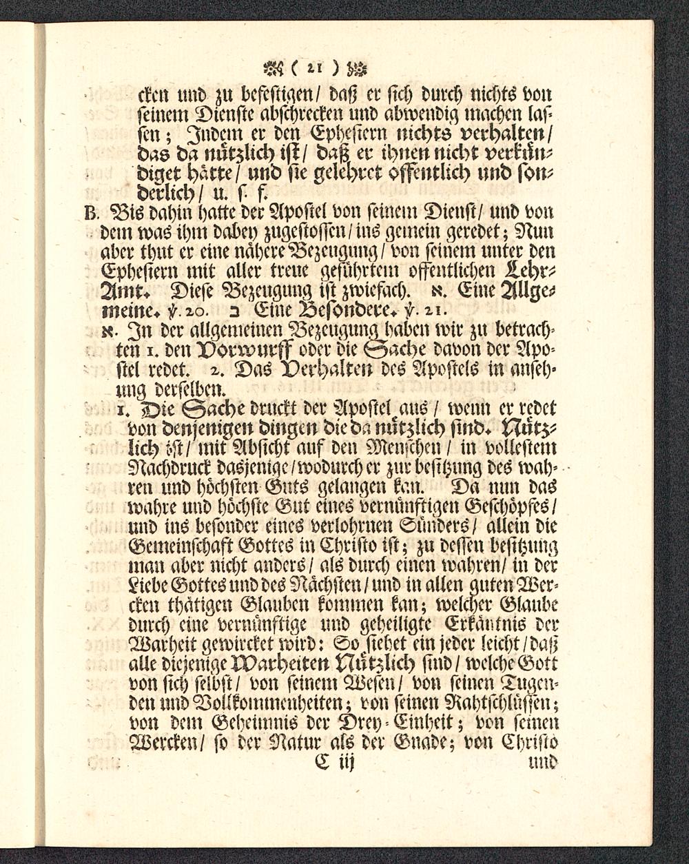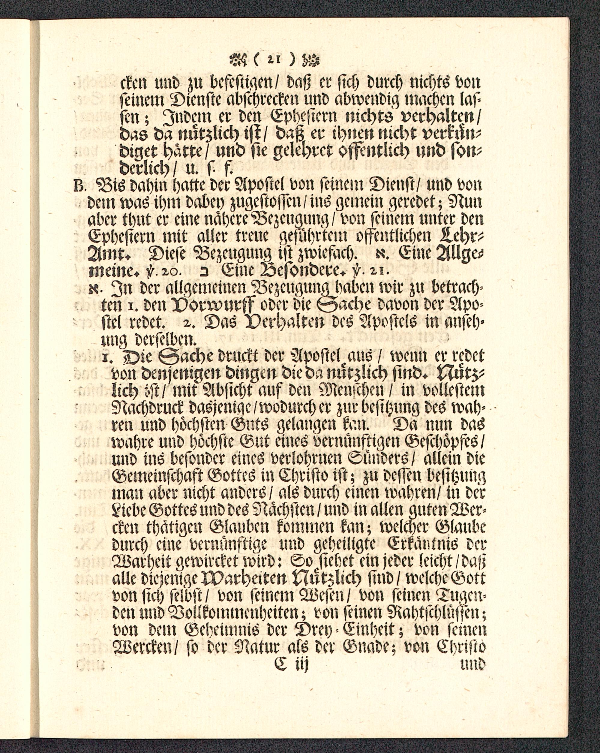 cken und zu befestigen/ daß er sich durch nichts vonseinem Dienste abschrecken und abwendig machen las-sen; Indem er den Ephcsiern nichts verhalten/das da nützlich iji/ daß er ihnen nicht verkün-diget Hütte / und jle gelehret öffentlich und son-derlich/ u. s f.K. Bis dahin hatte der Apostel von seme>n Dienst/ und vondem was ihm dabey zugeflossen/ins gemein geredet; Nunaber thut er eine nähere Bezeugung / von seinem unter denEphesiern mit aller treue geführtem öffentlichen Lehr-Amt. Diese Bezeugung ist zwiefach, n. Eine Allge-meine. ^ 2 Eine Besondere. ^. 2.1.x. In der allgemeinen Bezeugung haben wir zn betrach-ten i. den Vorrvurff oder die ^>ache davon der Apo-stel redet. ^. Das Verhalten des Apostels in anseh-ung derselben. ^i. Die Sache druckt der Apostel^aus / wenn er redetvon denjenigen dingen die da nützlich sind. Nütz-lich i'st/ mit Absicht auf den Menschen / in vollestemNachdruck dasjenige /wodurch er zur bcsitzung des wah-ren und höchsten Guts gelangen ßan. Da nun daswahre und höchste Gut eines vernünftigen Geschöpfes/und ins besonder eines verlohnten Sünders/ allein dieGemeinschaft Gottes in Christo ist; zu desien besitzungman aber nicht anders / als durch einen wahren/ in derLiebe Gottes und des Nächsten / und in allen guten Wer-tteil thatigen Glauben kommen kan; welcher Glaubedurch eine vernünftige mW geheiligte ErkaMnis derWarheit gewircket wird: Vo.siebet ein jeder leicht/ dajjalle diejenige Warheiten Nützlich sind / welche Gottvon sich selbst/ von seinem Westn/ von seinen Tugen-den mW Vollkommenheiten; von seinen Nahtschlüsien;von dem Gebeimnis der Drey - Einheit; von seinenWertten/ so der Natur als der Gnade; von Christo