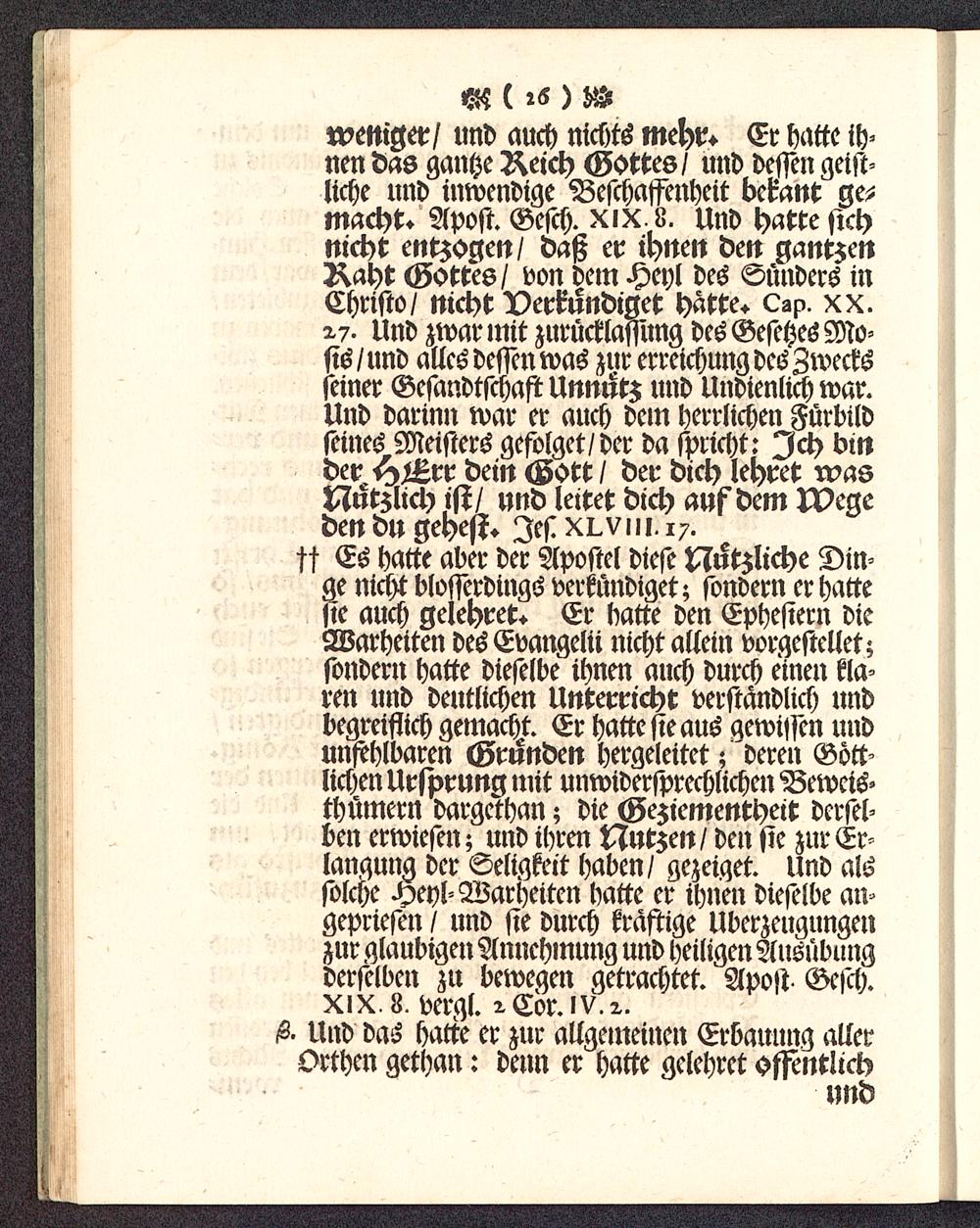 ff Es hatte aber der Apostel diese Nutzliche Din-ge nicht blosserdings verkündiget; sondern er hattesie auch gelehret. Er hatte den Ephesiern dieWarheiten des Evangelii nicht allein vorgestellet;sondern hatte dieselbe ihnen auch durch einen kla-ren und deutlichen Unterricht verstandlich undbegreiflich gemacht. Er hatte sie aus gewissen undunfehlbaren Gründen hergeleitet; deren Gött-lichen Ursprung mit unwidersprechlichen Beweis-thümern dargethan; die Geziementheit dersel-ben erwiesen; und ihren Nutzen / den sie zur Er-langung der Seligkeit haben/ gezeiget. Und alssolche Heyl-Warheiten hatte er ihnen dieselbe an-gepriesen / und sie durch kräftige Überzeugungenzur glaubigen Annehmung und heiligen Ausübungderselben zu bewegen getrachtet. Apost Gesch.xix 8. vergl. »Cor.iv.-../S. und das hatte er zur allgemeinen Erbauung aller