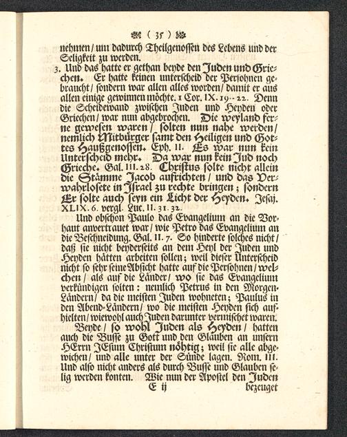 ). Und das hatte er gethan beyde den Juden und Grie-chen. Er hatte keinen unterscheid der Perjohnen ge-braucht/ sondern war allen alles worden/ damit er ausallen einige gewinnen möchte, i Cor. ix. it) - 2.2.. Denndie Scheidewand zwischen Juden und Heyden oderGriechen / war nun abgebrochen. Die weyland fer-ne gewesen waren/ sollen nun nahe werden/nemlich Mitbürger samt den Heiligen und Got-tes Haußgenossen. Eph. u. Ms war nun keinUnterscheid mehr. Da war nun kein Jud nochGrieche. Gal.iu.^8. Christus solte mcht allemdie Stamme Jacob aufrichten / und das Ver-wahrloset in Israel zu rechte bringen; fondernKr solte auch seyn em Licht der Heyden. Jesaj.xi.ix.6. vergl Luc.il.zi Z2-.