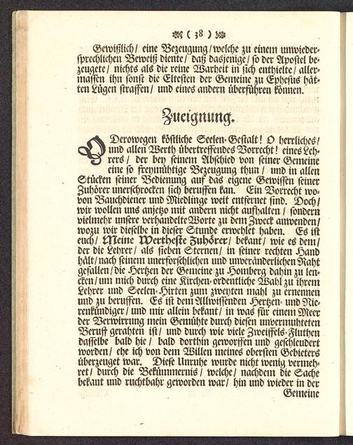 Derowegen köstliche Seelen-Gestalt? O herrliches^und allen Werth übertreffendes Vorrecht? eines Lch-rers / der bey seineni Abschied von seiner Gemeineeine so freymühtige Bezeugung thun / und in allenStücken seiner Bedienung auf das eigene Gewissen setnerZuhörer unerschrocken sich beruffen kan. Ein Vorrecht wo-von Bauchdiener und Miedlinge weit entfernet sind. Doch/wir wollen uns anjetzo mit andern nicht aushalten / sondernvielmehr unsere verhandelteWorte zu dem Zweck anwenden/wozu wir dieselbe in dieser Stunde erwchlet haben. Es Neuch/ Meine wertheste Zuhörer/ bekant/ wie es dem/der die Lehrer/ als sieben Sternen/ in seiner rechten Handbalt/nach seinem unerforschlichen und unveränderlichen Nahtgefallen/die Hertzen der Gemeine zu Homberg dahin zu len-ckcn/um mich durch eine Kirchen-ordentliche Wahl zu ihremLehrer und Seelen-Hirten zum zweyten mahl zu ernennenund zu beruffen. Es ist dem Allwissenden Hertzen- und Nie-renkündiger/ uud mir allein bekant/ in was für einem Meerder Verwirrung mein Bemühte durch diesen unvermudtetenBerufs-gerahten ist/ und durch wie viele Zweiffels-Fluchendasselbe bald hie / bald dorthin geworffen und geschleudertworden/ ehe ich von dein Willen meines obersten Gebietersüberzeuget war. Diese Unrnhe wurde nicht wenig vermeh-ret/ durch die Bekümmernis / welche/ nachdem die Sachebekant und ruchtbahr geworden war/ hin und wieder in der