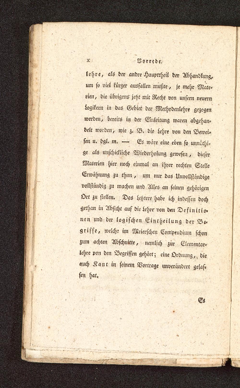 lehre, als der andre Haupttheil der Abhandlung,um so viel kürzer ausfallen mußte/ je mehr Mate-rien , die übrigens jetzt mit Recht von unsern neuernjogikern in das Gebiet der Methodenlehre gezogenwerden, bereits in der Einleitung waren abgehan-delt worden, wie z. B. die Lehre von den Bewei-sen u. dgl. m. —^ Es wäre eine eben so unnöthi-ge als unschickliche Wiederholung gewesen, dieserMaterien hier noch einmal an ihrer rechten StelleErwähnung zu thun, um nur das Unvollständigevollständig zu machen und Alles an seineu gehörigenOrt zu stelle». Das letztere habe ich indessen dochgethan in Absicht auf dielehre von den Definitio-nen und der logischen Eintheilung der Be-griffe, welche im Meierschcn Compendium schonzum achten Abschnitte, neinlich zur Elementar-lehre pon den Begriffen gehört; eine Ordnung,, diequch Kant in seinein Vortrage unverändert gelas-sen hat»