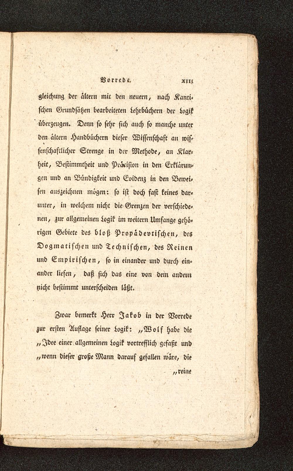 Zwar bemerkt Herr Jakob in der Vorredezur ersten Auflage seiner Logik: „Wolf habe die„Idee einer allgemeinen Logik vortrefflich gefaßt und„wenn dieser große Mann darauf gefallen wäre, die