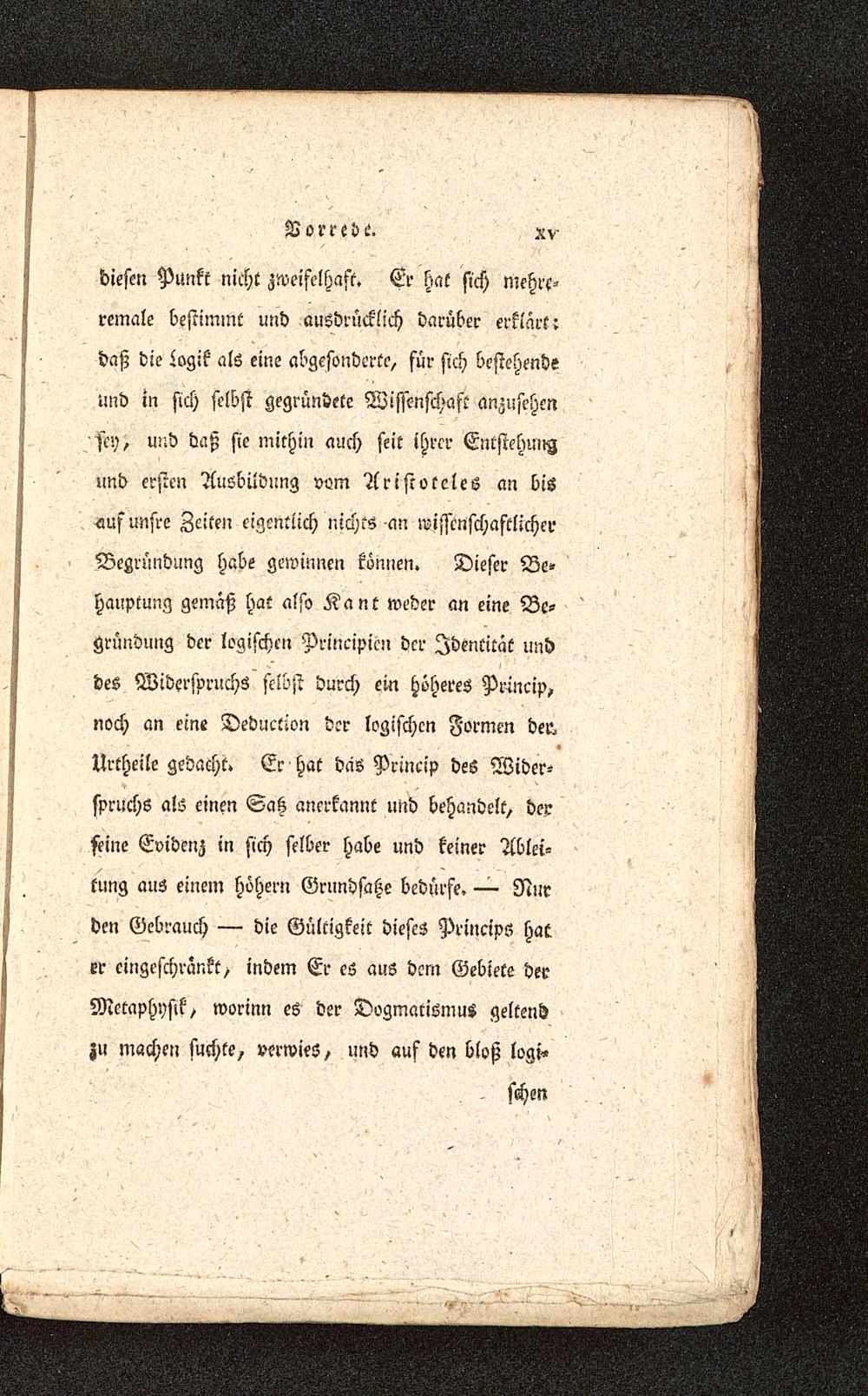 diesen Punkt nicht zweifelhaft. Er hat sich Mehrc-remale bestimmt und ausdrücklich darüber erklärt:daß die iogik als eine abgesonderte, für sich bestehendeund in sich selbst gegründete Wissenschaft anzusehensey, und daß sie mithin auch seit ihrer Entstehungund ersten Ausbildung vom Aristoteles an bisÄuf unsre Zeiten eigentlich nichts an wissenschaftlicherBegründung habe gewinnen können. Dieser Be-hauptung gemäß hat also Kant weder an eine Be-gründung der logischen Principien der Identität unddes Widerspruchs selbst durch ein höheres Pnncip,noch an eine Deduction der logischen Formen dee,Urtheile gedacht. Er hat das Princip des Wider-spruchs als einen Sah anerkannt und behandelt, derseine Evidenz in sich selber habe und keiner Ablei-tung aus einem höhern Grundsatze bedürfe. — Nurden Gebrauch — die Gültigkeit dieses Princips hater eingeschränkt/ indem Er es aus dem Gebiete derMetaphysik, worinn es der Dogmatismus geltendzu machen suchte, verwies, und auf den bloß logi«