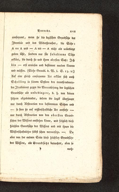 consequent, wenn sie' die logischen Grundsatze derIdentität und. des Widerspruches, die Sätze:^ ^ und — ^ ---- — ^ nicht als unbedingtgelten laßt, sondern nur für subalterne Sätzeerklärt, die durch sie und ihren obersten Saß: Ichbin — erst erwiesen und bestimmt werden könnenund müssen. (Siehe Grundl. d. W. L. S. i z. ?c.)Auf eine gleich consequente Art erklärt sich auchSchelling in seinem System des transscendenta-len Idealismus gegen die Voraussehung der logischenGrundsätze als unbedingter, d. h. von keinenhöhern abzuleitender, indem die jogik überhauptnur durch Abstraction von bestimmten Säßen und— so fern sie auf wissenschaftliche Art entsteht —nur durch Abstraction von den obersten Grund-sätzen des Wissens entstehen könne, und folglich diesehöchsten Grundsätze des Wissens und mit ihnen dieWissenschaftölehre selbst schon voraussetze. —- D«aber von der andern Seite diese höchsten Grundsätzedes Wissens, als Grundsätze betrachtet, eben s»