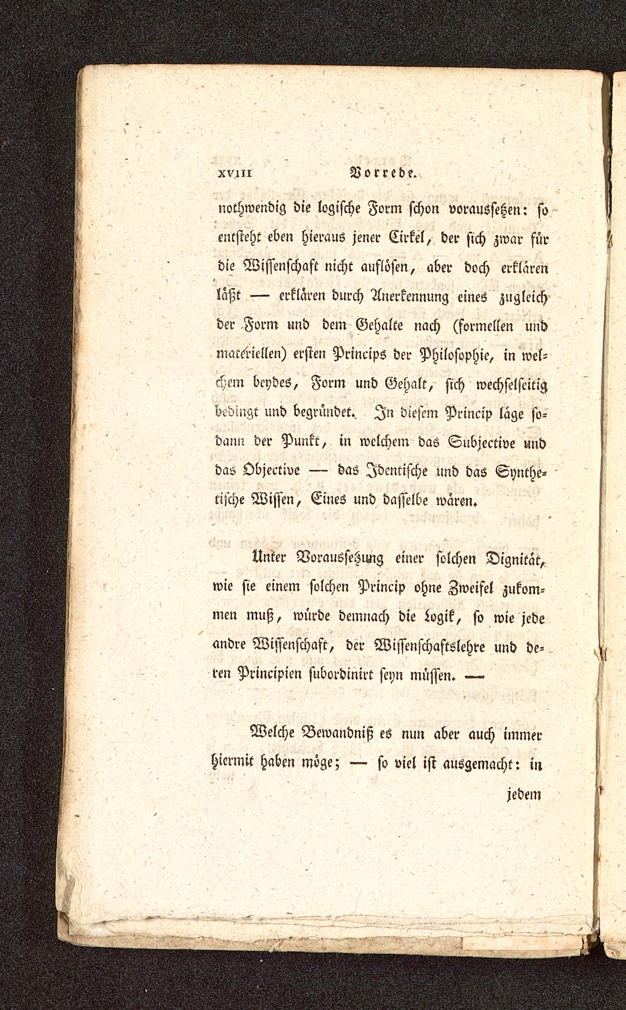 nothwendig die logische Form schon voraussetzen: soentsteht eben hieraus jener Cirkel, der sich zwar fürdie Wissenschaft nicht auflösen, aber doch erklarenlaßt -— erklaren durch Anerkennung eines zugleichder Form und dem Gehalte nach (formellen undmateriellen) ersten Princips der Philosophie, in wel-chem beydes, Form und Gehalt, sich wechselseitigbedingt und begründet. In diesem Princip läge so-dann der Punkt, in welchem das Subjective unddas Objective — das Identische und das Synthe-tische Wissen, Eines und dasselbe wären.