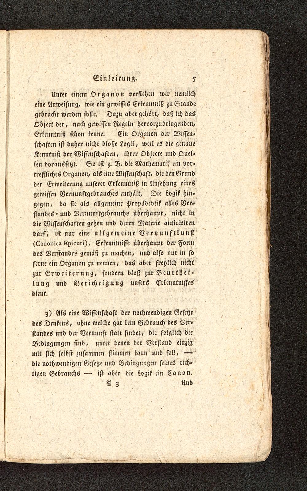 - Unter einem Organon verstehen wir nemlicheine Anweisung, wie ein gewisses Erkenntniß zu Standegebracht werden solle. Dazu aber gehört, daß ich dasObject der, nach gewissen Regeln hervorzubringenden,Erkenntniß schon kenne. Ein Oraanon der Wissen-schaften ist daher nicht bloße Logik, weil es die genaueKenntniß der Wissenschaften, ihrer Objecte und Quel-len voraussetzt. So ist z. B. die Mathematik ein vor-treffliches Organon, als eine Wissenschaft, die den Grundder Erweiterung unserer Erkenntniß in Ansehung einesgewissen Vernunftgebrauches enthalt. Die Logik hin-gegen, da sie als allgemeine Propadevtik alles Ver-standes- und Vernunftgebrauchs überhaupt, nicht indie Wissenschaften gehen und deren Materie anticipireildarf, ist nur eine allgemeine Vernunft kunst(Lanonicit Kpicuri), Erkenntnisse überhaupt der Formdes Verstandes gemäß zu machen, und also nur in soferne ein Organon zu nennen, das aber freylich nichtzur Erweiterung, sondern bloß zur Beurthei-lung und Berichtigung unsers Erkenntnissesdient.