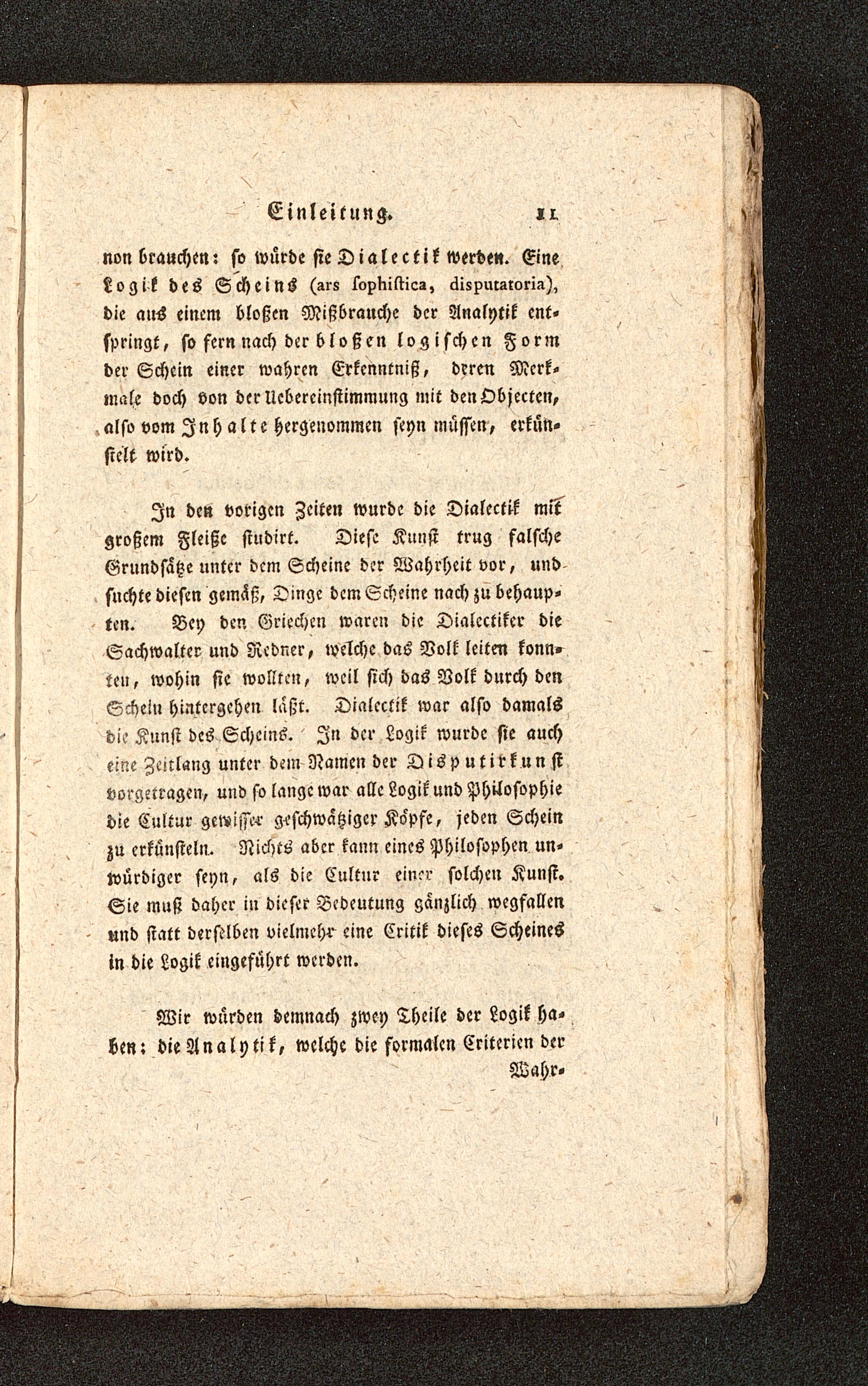 In den votigen Zeiten wurde die Dialectlk mlkgroßem Fleiße studirt. Diese Kunst trug falscheGrundsatze unter dem Scheine der Wahrheit vor, undsuchte diesen gemäß, Dinge dem Scheine nach zu behaup-ten. Bey den Griechen waren die Dialectiker dieSachwalter und Redner, welche das Volk leiten konn-ten, wohin sie wollten, weil sich das Volk durch denSchein hintergehen läßt. Dialcctik war also damalsdie Kunst des Scheins. In der Logik wurde sie aucheine Zeitlang unter dem Namen der Disputirk un stvorgetragen, und so lange war alle Logik und Philosophiedie Cultur gewisse geschwätziger Kopfe, jeden Scheinzu erkünsteln. Nichts aber kann eines Philosophen un-würdiger seyn, als die Cultur ein^r solchen Kunst.Sie muß daher in dieser Bedeutung ganzlich wegfallenund statt derselben vielmehr eine Critik dieses Scheinesin die Logik eingeführt werden.