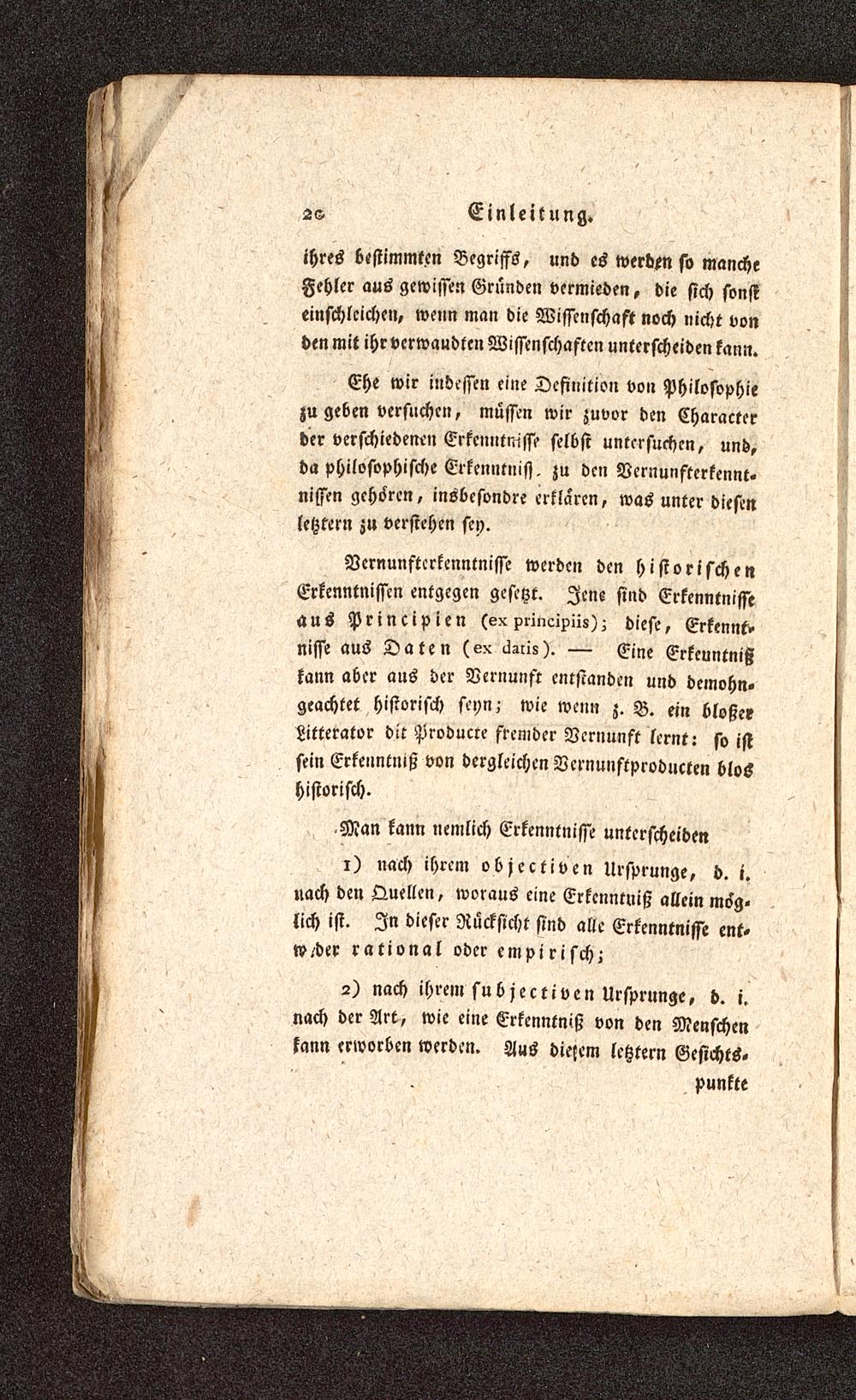 Ehe wir indessen eine Definition von Philosophiezu geben versuchen, müssen wir zuvor den Characterder verschiedenen Erkenntnisse selbst untersuchen, und,da philosophische Erkenntnisi. zu den Vernunfterkennt,nissen gehören, insbesondre erklaren, was unter diesenletztern zu verstehen sey.