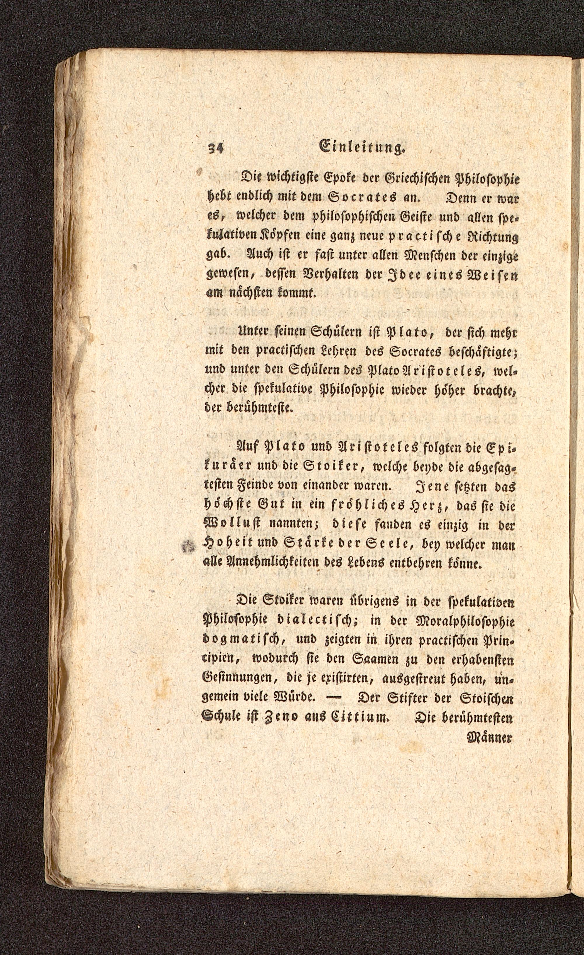 Die wichtigste Epoke der Griechischen Philosophiehebt endlich mit dem Socrates an. Denn er wares, welcher dem philosophischen Geiste und allen spe-kulativen Kopsen eine ganz neue praotische Richtunggab. Auch ist er fast unter allen Menschen der einzigegewesen, dessen Verhalten der Idee eines Weisenam nächsten kommt.