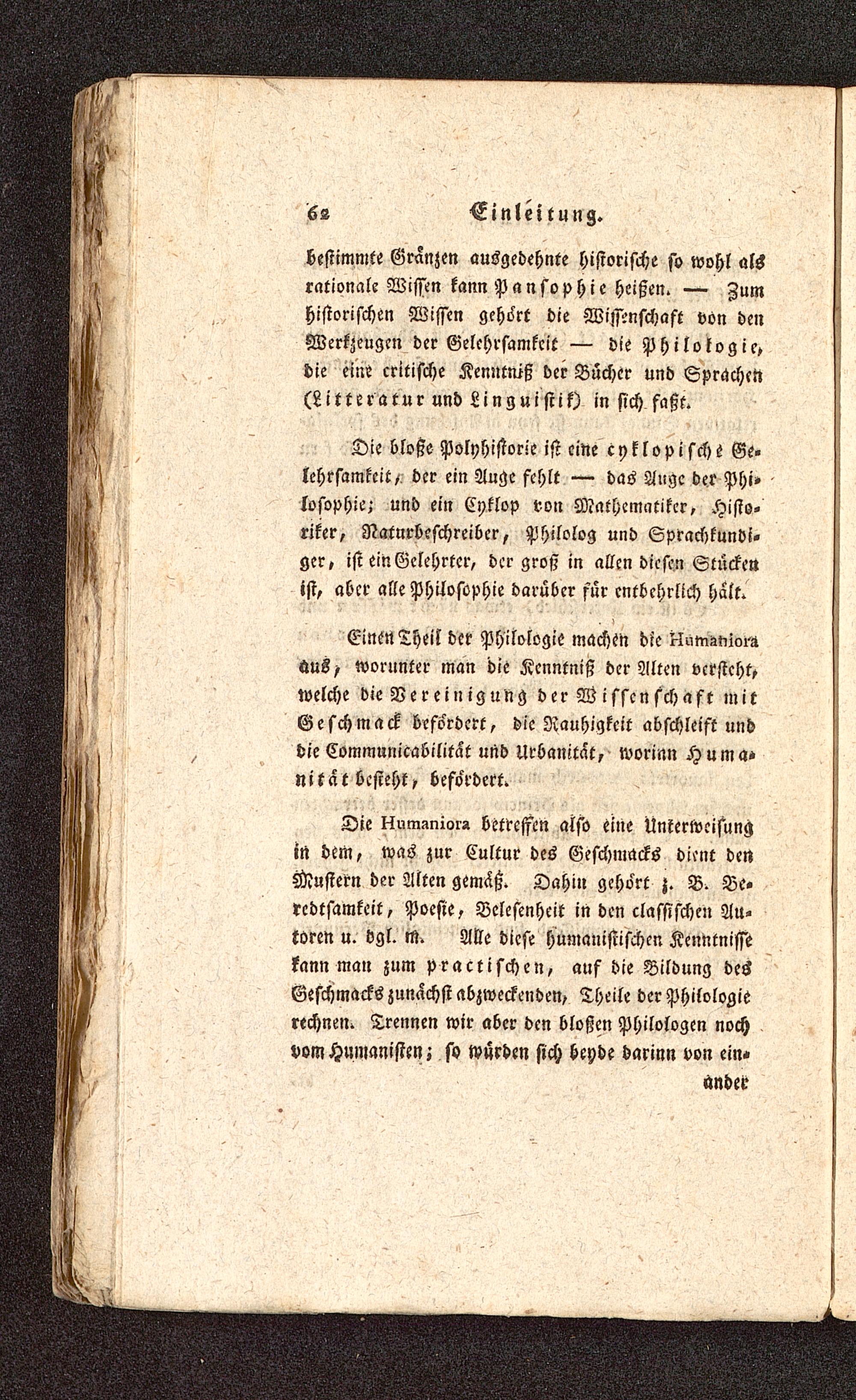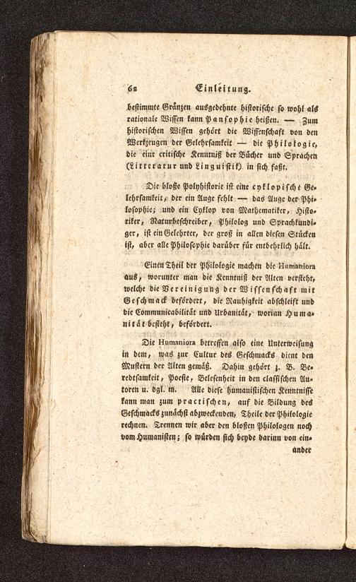 Einen Theil der Philologie machen die i-lum^im-züus> worunter man die Kenntniß der Alten versteht,welche die Vereinigung der W isscn schaft mitGeschmack befördert, die Rauhigkeit abschleift unddieCommunicabilitat und Urbanität, worinn Huma-nität besteht, befördert.