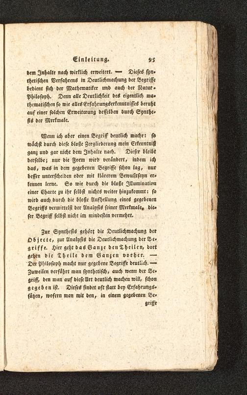 Zur Synthesis geHort die Deutlichmachung derObjecte, zur Analysis die Deutlichmachung der D e»griffe. Hier geht das Ganze den Theilen, dortgehen die Theile dem Ganjen vorher.Der Philosoph macht nur gegebene Begriffe deutlich.—Zuweilen verfährt man synthetisch, auch wenn der Be»griff, den man auf diese Art deutlich machen will, schongegebenist. Dieses findet oft statt bey Erfahrungs-sätzen, wofern man mit den, in einem gegebenen Be«