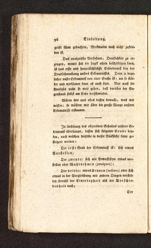 Das analytische Verfahren, Deutlichkeit zu er.zeugen, womit sich die Logik allein beschäftigen kann,ist das erste und hauptsächlichste Erfordernis) bey derDeutlichmachung unsers Erkenntnisses. Denn je deut-licher Unser Erkenntniß von einer Sache ist: um so stär.ker und wirksamer kann es auch seyn. Nur muß dieZlnalysis nicht so weit gehen, daß darüber der Ge^genstand selbst am Ende verschwindet.