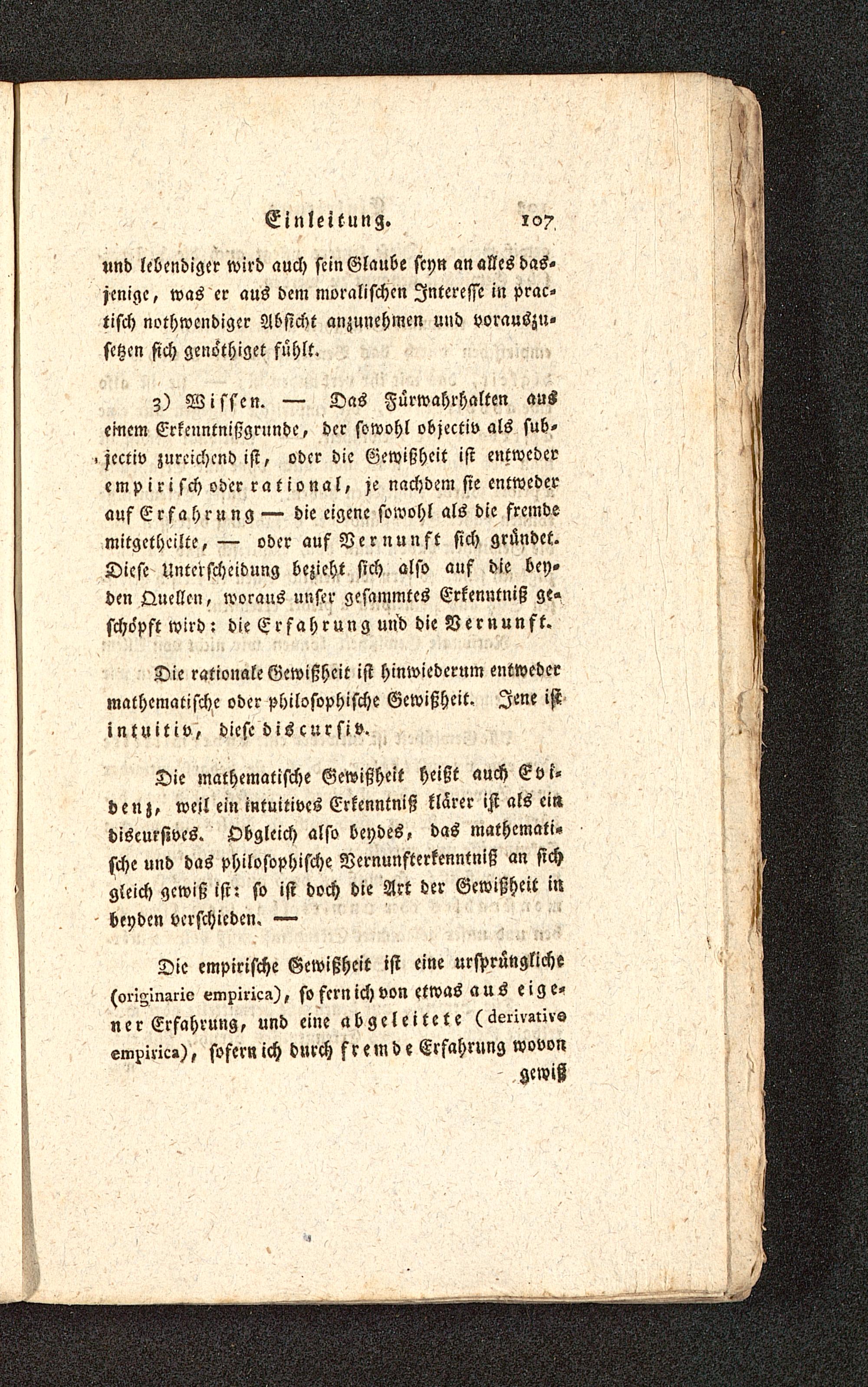 Die mathematische Gewißheit heißt auch Evi-denz, weil ein intuitives Erkenntniß klärer isi als ei»discursives. Obgleich also beydes, das mathemati-sche und das philosophische Vernunfterkenntniß an sichgleich gewiß ist: so ist doch die Art der Gewißheit inbeyden verschieden. —»