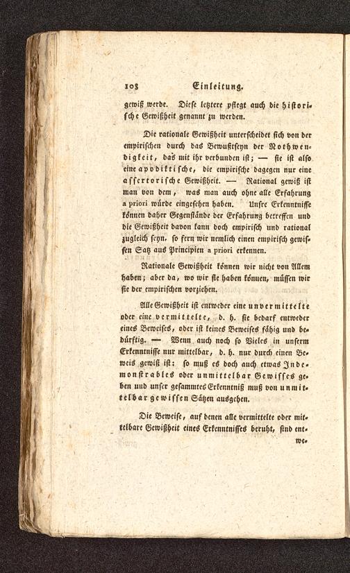 Alle Gewißheit ist entweder eine unvermittelteoder eine vermittelte, d. h. sie bedarf entwedereines Beweises, oder ist keines Beweises fähig und be-dürftig. Wenn auch noch so Vieles in unsermErkenntnisse nur mittelbar, d. h. nur durch einen Be-weis gewiß ist: so muß es doch auch etwas In de-inen strables oder unmittelbar Gewisses ge-den und unser gesammtes Erkenntniß muß von unmit-telbar g e w i sse n Sätzen ausgehen.