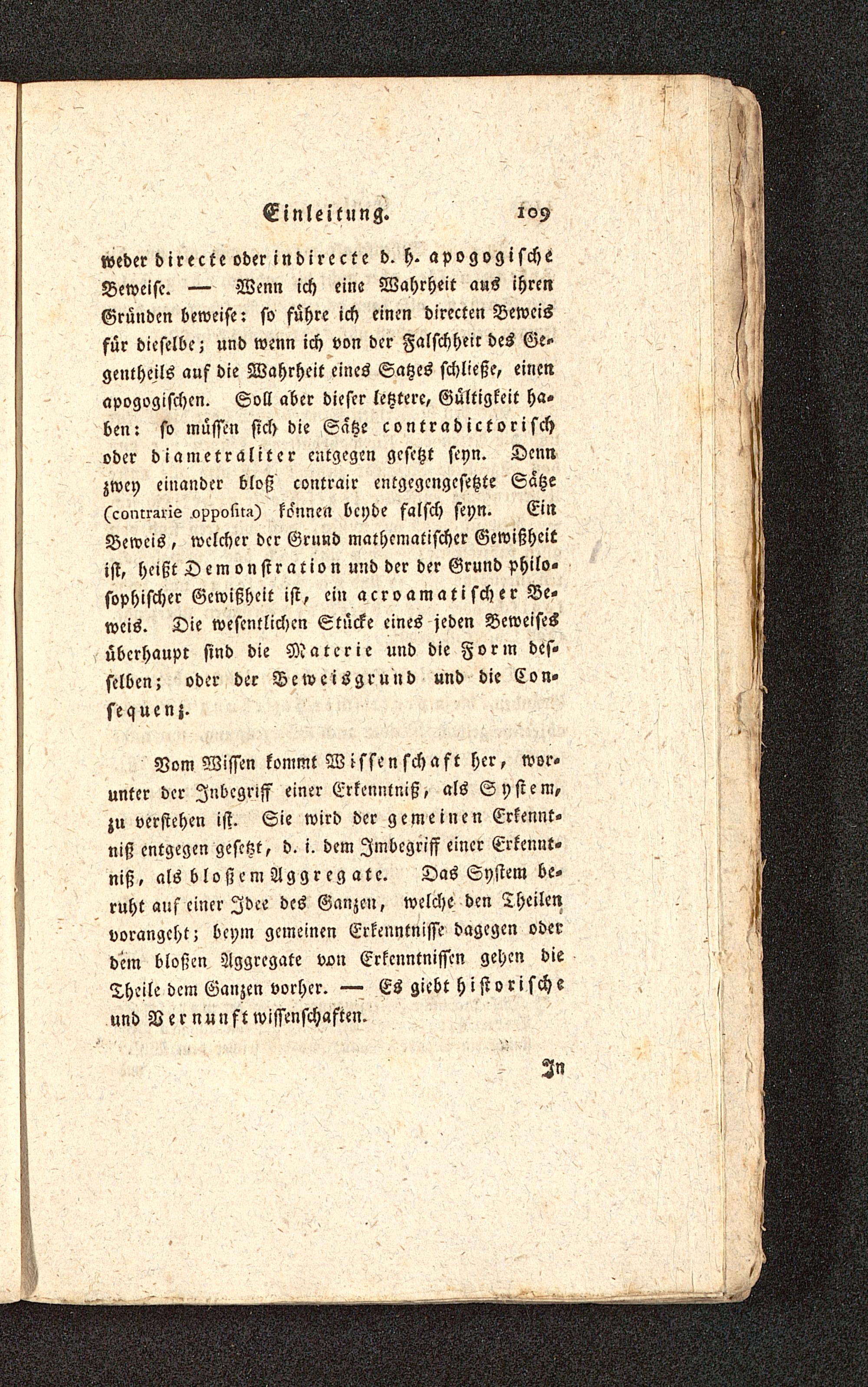 Vom Wissen kommt W issenschaft her, wsr-unter der Inbegriff einer Erkenntniß, als System,ju verstehen ist. Sie wird der gemeinen Erkennt-niß entgegen gesetzt, d. i. dem Jmbegriff einer Erkennt-niß, als bloßem Aggreg ate. Das System be-ruht auf einer Idee des Ganzen, welche den Theilenvorangeht; beym gemeinen Erkenntnisse dagegen oderdem bloßen Aggregate von Erkenntnissen gehen dieTheile dem Ganzen vorher. —- Es giebt historischeund Vernunft Wissenschaften.