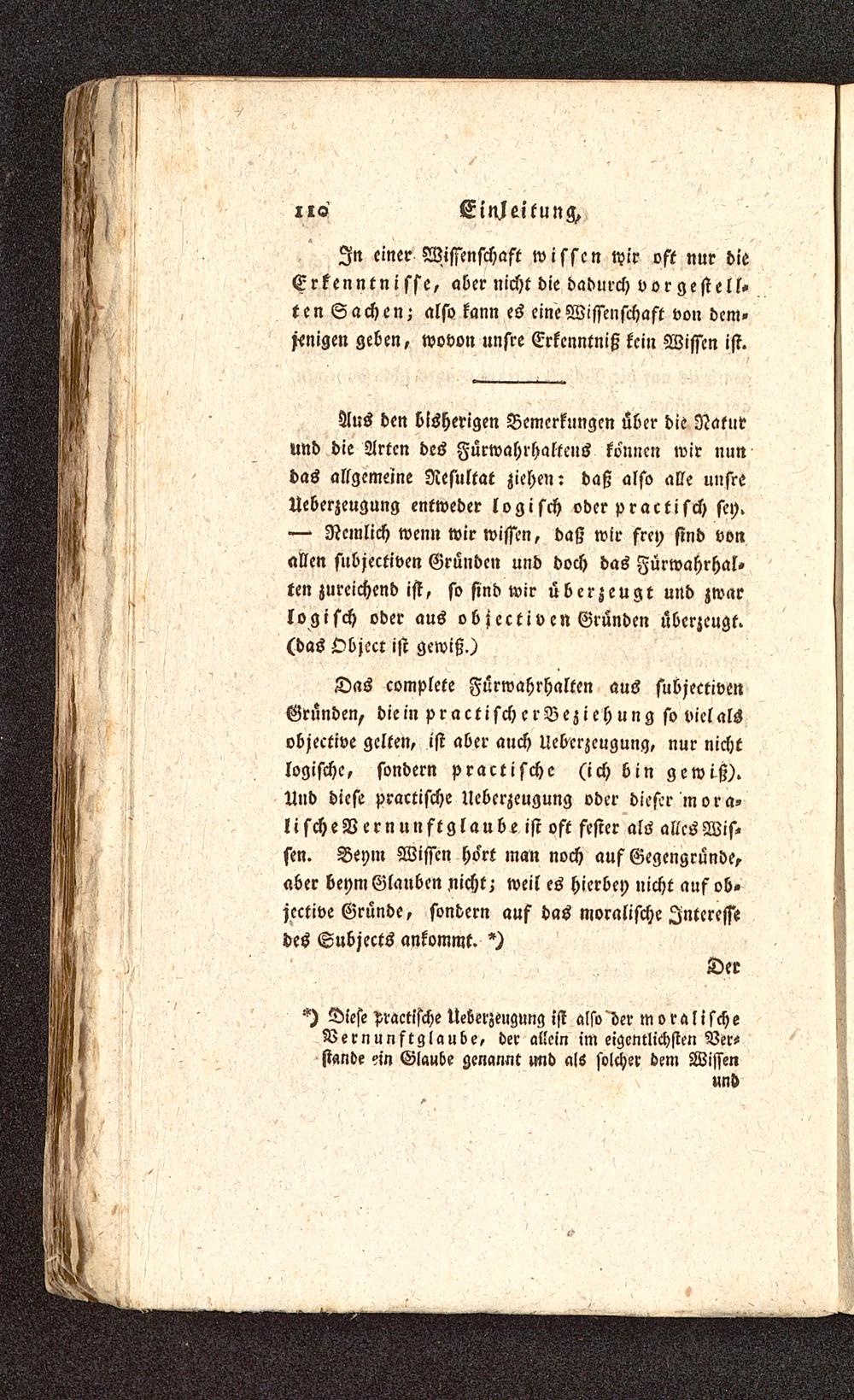 Das complete Fürwahrhalten auS fubjectivenGründen, die in practischcrBeziehung so viel alsobjective gelten, ist aber auch Ueberzeugung, nur nichtlogische, sondern pracrische (ich bin gewrß).Und diese praktische Ueberzeugung oder dieser mora-lischeVernunftglaube ist oft fester als allcsWis»sen. Beym Wissen Hort man noch auf Gegengründe,aber beym Glanben nicht; weil es hierbei) nicht auf ob«jcctive Gründe, sondern auf das moralische Interessedes Subjects ankommt. *)