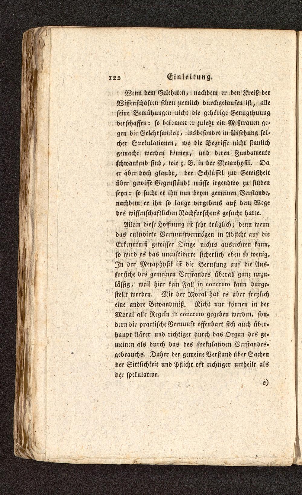 Wenn dem Gelehrten, nachdem er den Kreiß derWissenschaften schon ziemlich durchgelaufen ist, alleseine Bemühungen nicht die gehörige Genugthuungverschaffen: so bekommt er zuletzt ein Mißtrauen ge-gen die Gelehrsamkeit, insbesondre in Ansehung sol-cher Spekulationen, wo die Begriffe nicht sinnlichgemacht werden können, und deren Fundamenteschwankend sind, wie z. B. in der Metaphysik. Daer aber doch glaubt, der Schlüssel zur Gewißheitüber gewisse Gegenstand! müsse irgendwo zu findenseyn: so sucht er ihn nun beym gemeinen Verstände,nachdem er ihn so lange vergebens auf dem Wegedes wissenschaftlichen Nachforschcns gesucht hatte.