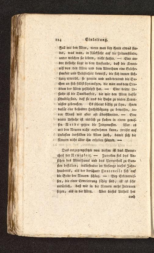 Fall mit den Alten, wenn man bey rhncn etwas fin-det, was man, in Rücksicht auf die Zeitumstande,unter welchen sie lebten, nicht suchte. — Eine an-dre Ursache liegt in dem Umstände, daß die Kennt-niß von den Alten und dem Alterthum eine Gelehr-samkeit und Vclcscnheir beweist, die sich immer Ach-tung erwirbt, so gemein und unbedeutend die Sa.chen an sich selbst seyn mögen, die man ausdem Stu-dium der Alten geschöpft hat. Eine dritte Ur-fache ist die Dankbarkeit, die wir den Alten dafürMuldig sind, daß sie uns die Bahn zu vielen Kennt-nissen gebrochen. Es scheint billig zu seyn, ihnendafür eine besondre Hochschatzung zu beweisen, de-ren Maaß wir aber oft überschreiten. — Einevierte Ursache ist endlich zu suchen in einem gewis-sen Neide gegen die Zeitgenossen. Wer esmit den Neuern nicht aufnehmen kann, preiset aufUnkosten derselben die Alten hoch, damit sich dieNeuern nicht über ihn erheben kennen.