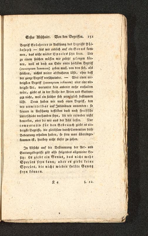In Absicht auf die Bestimmung der Mt- undGattungsbegriffe gilt also folgendes allgemeine Ge-setz: Es giebt ein Genus, das nicht mehrSpecies seyn kann; aber es giebt keineSpecies, die nicht wieder sollte Genntzseyn können.