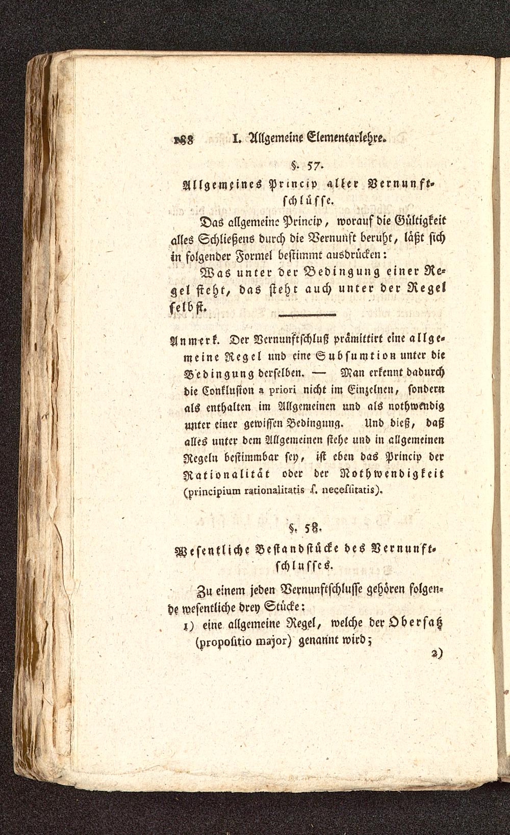 An m erk. Der Vcrnunstschluß pramittirt eine allge»meine Regel und eine Subsumtion unter dieBedingung derselben. — Man erkennt dadurchdie Conklusion » xrivri nicht im Einzelnen, sondernals enthalten im Allgemeinen und als nothwendigvptcr einer gewissen Bedingung. Und dieß, daßalles unter dem Allgemeinen stehe und in allgemeinenRegeln bestimmbar sey, ist eben das Princip derRatio na litat oder der Nothwendigkeit(princixiuw r-tlionslicqti« ^. uecoMau!).