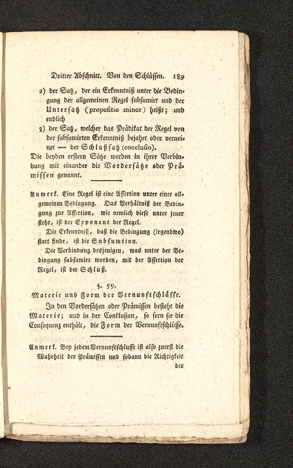 z) der Saß/ welcher das Prädikat der Regel vonder subsumirten Erkenntniß bejahet oder vernei«Net — derSchlußsatz (concluüo).Die beyden erster» Sahe werden in ihrer Verbin«dung mit einander die Vordersätze oder Prä-missen genannt.