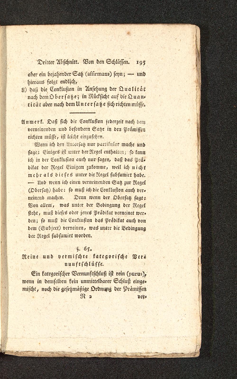 aber ein bejahender Satz (Mrmsns) seyn; — undhieraus folgt endlich/8) daß die Conklusion in Ansehung der Qualitätnach dem Oberseihe; in Rücksicht auf die Quan-tität aber nach demUntersaße sich richten müsse.