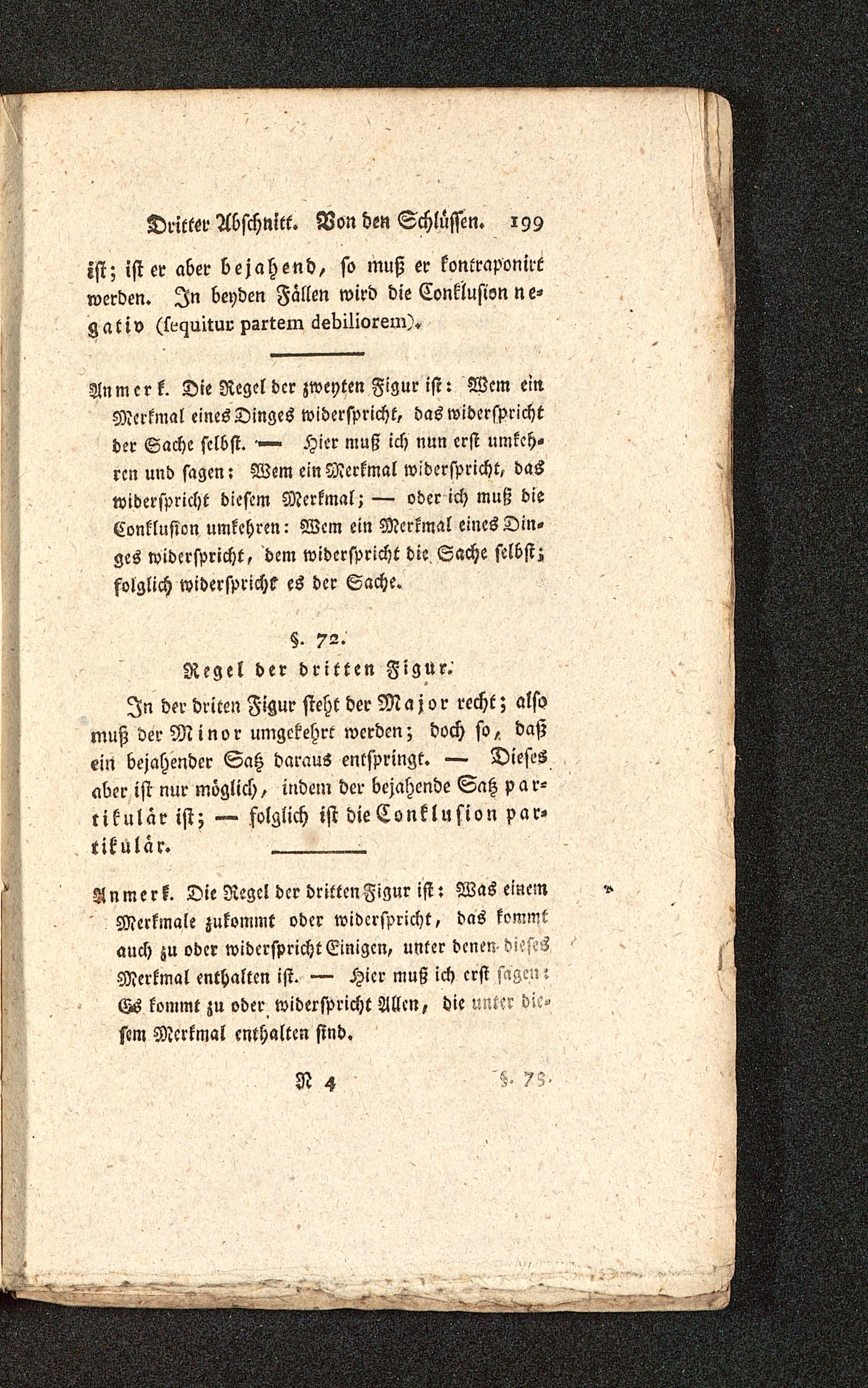 In der driten Figur steht derMaj 0 r recht; alsomuß derMinor umgekehrt werden; doch so, daßein bejahender Sah daraus entspringt. — Diesesaber ist nur möglich, indem der bejahende Satz par-tikular ist; — folglich ist die Conklusion par-tikulär.__