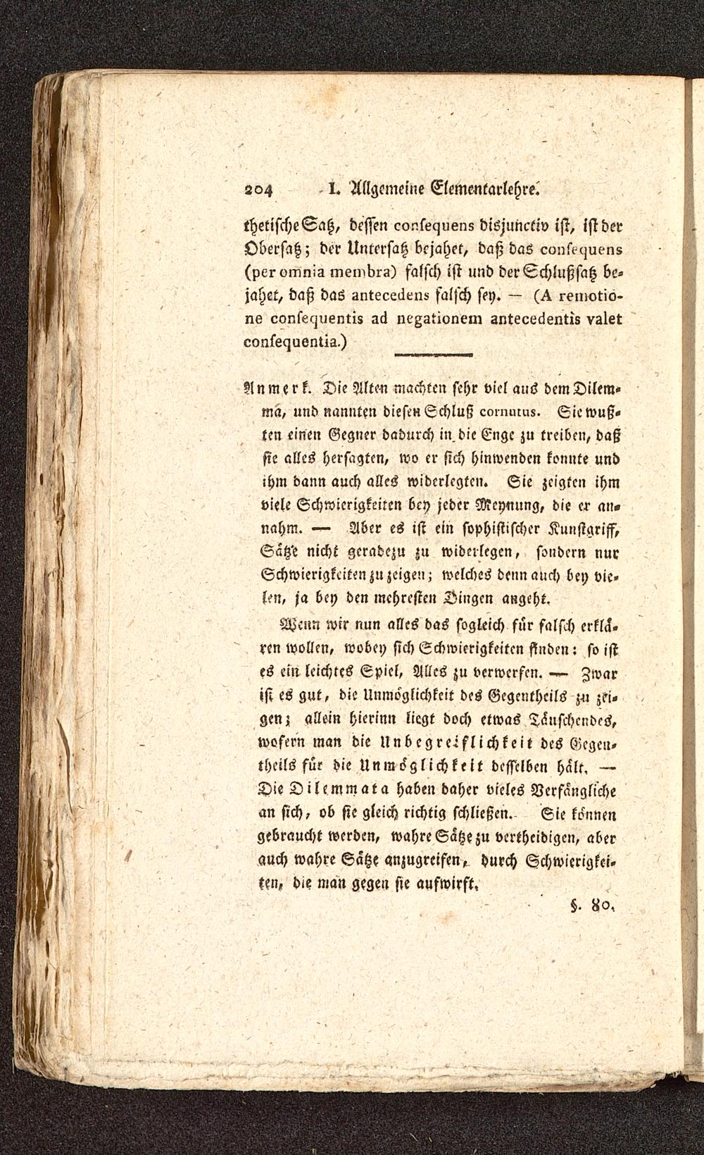 Anmerk. Die Alten machten sehr viel aus dem Dilem-ma, »nd nannten diese» Schluß coinucuz. Sie wuß-ten einen Gegner dadurch in. die Cnge zu treiben, daßsie alles hersagten, wo er sich hinwenden konnte undihm dann auch alles widerlegten. Sie zeigten ihmviele Schwierigkeiten bey jeder Meynung, die er an-nahm. — Aber es ist ein sophistischer Kunstgriff,Satz'e nicht geradezu zu widerlegen, sondern nurSchwierigkeiten zu zeigen; welches denn auch bey vie-len, ja bey den mchresten Dingen angeht.