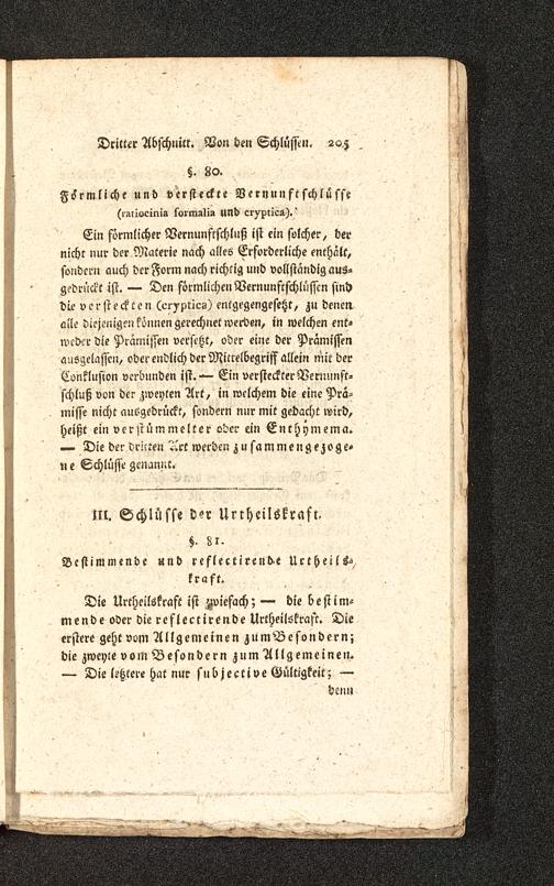 Die Urtheilskraft ist Hviefach; die bestim-mende oder die reflectirende Urtheilskraft. Dieerstere geht vom Allgemeinen zumBesondern;die zweyte vom Besondern zum Allgemeinen.— Die letztere hat nur subjective Gültigkeit; —-