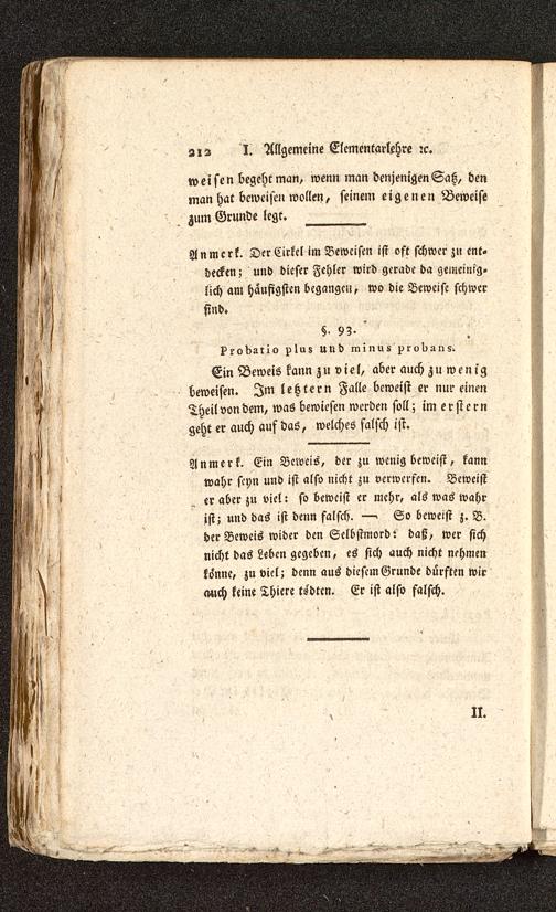 Anmerk. Ein Beweis, der zu wenig beweist, kannwahr seyn und ist also nicht zu verwerfen. Beweister aber zu viel: so beweist er mehr, als was wahrist; und das ist denn falsch. —> So beweist z. B.der Beweis wider den Selbstmord t daß, wer sichnicht das Leben gegeben, es sich auch nicht nehmenkönne, zu viel; denn aus diesem Grunde dürften wirmich keine Thiere tsdten. Er ist also falsch.